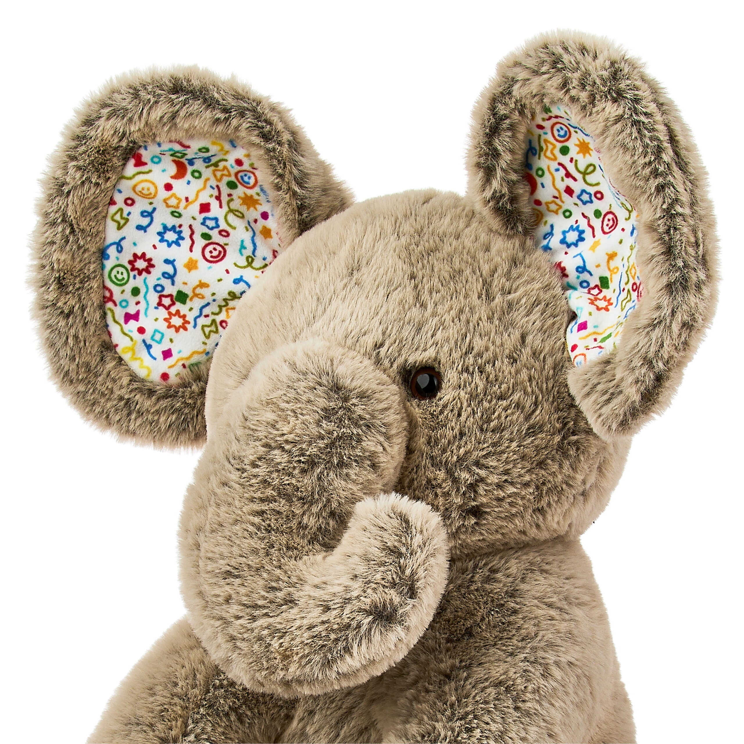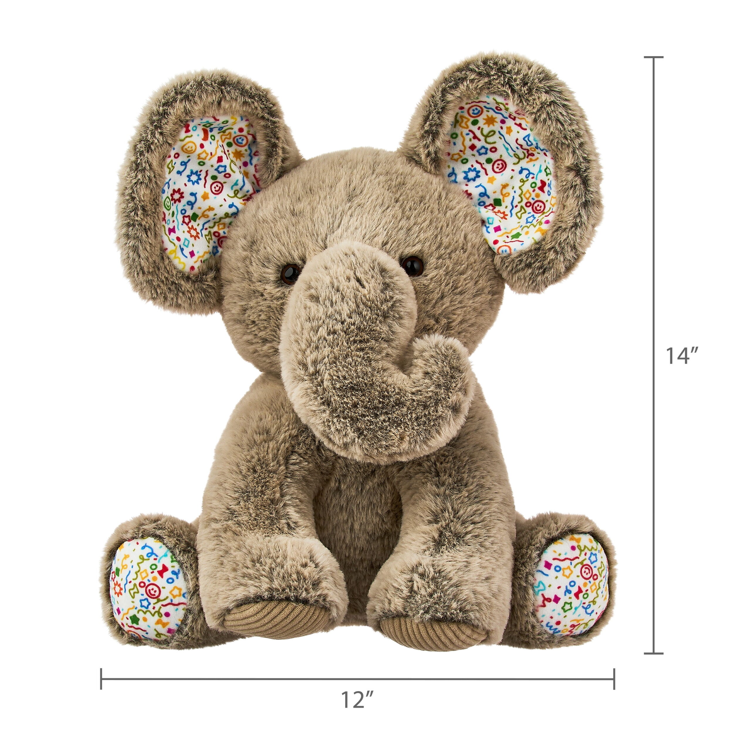 - Playful Accents: The elephant’s feet and ears are distinctively lined with vibrant confetti fabric, adding a unique and cheerful visual element to its design.