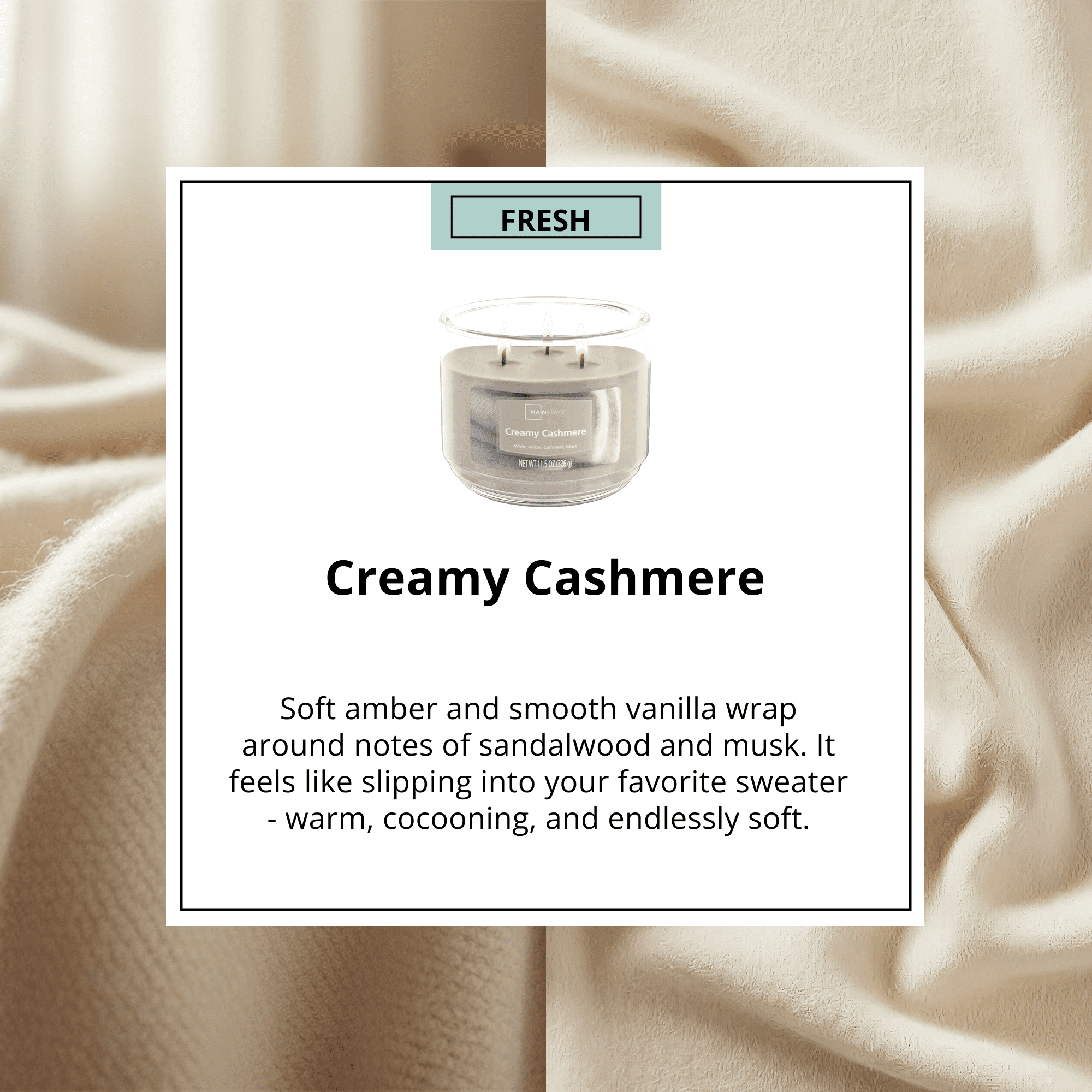 Cozy Fragrance: Features a warm and enveloping aroma with notes of soft white amber, creamy cashmere, and warm musk for a smooth, layered scent experience.