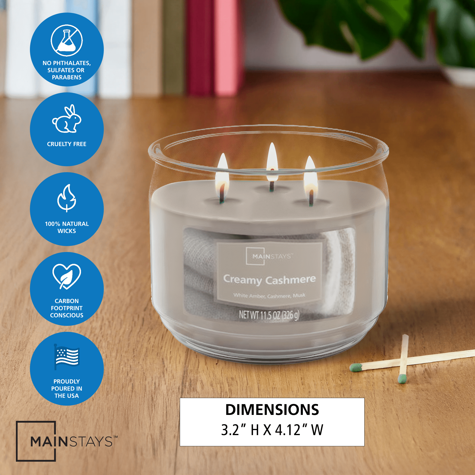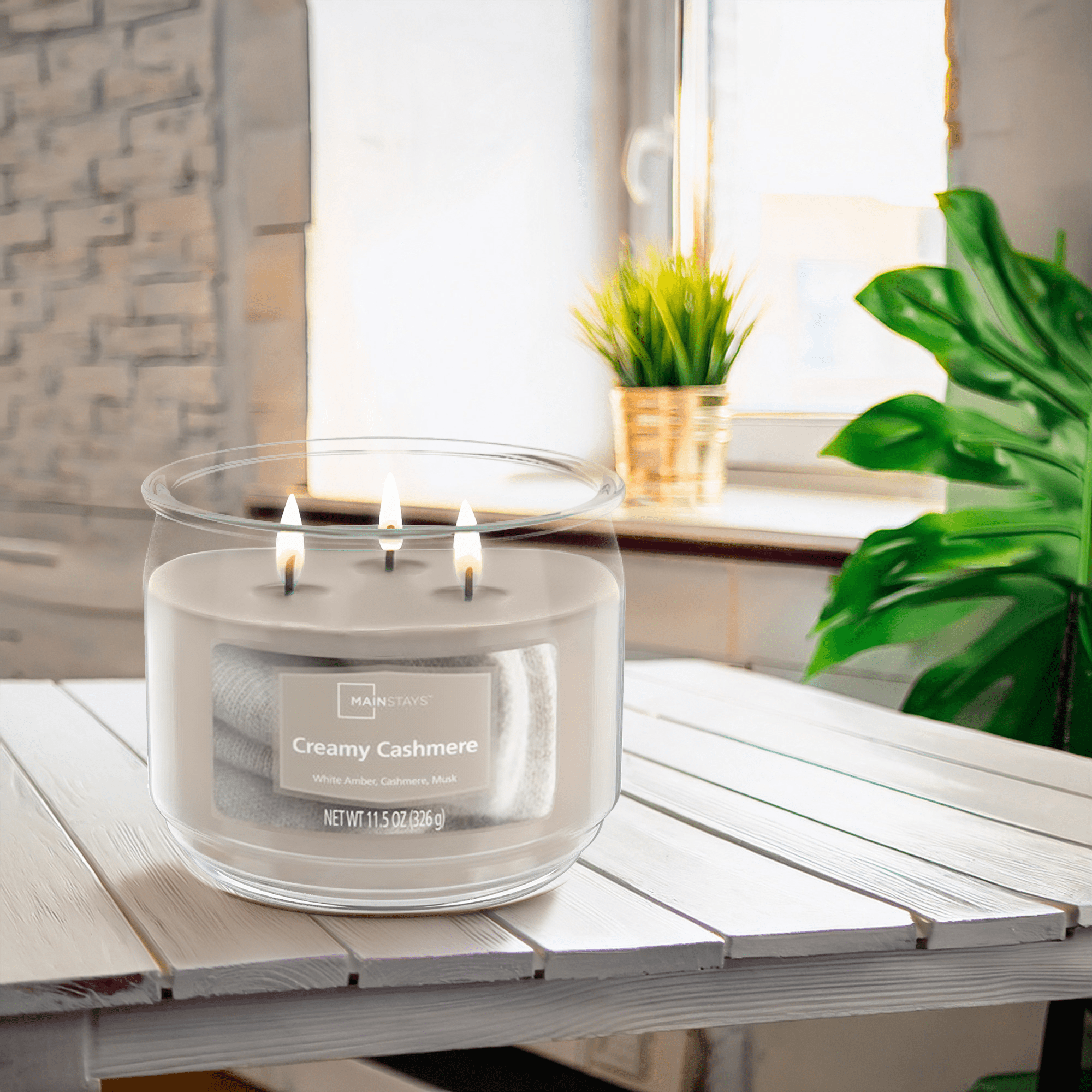 Surround yourself with the soft and comforting scent of the Mainstays Creamy Cashmere Scented 3-Wick Glass Jar Candle, 11.5 oz—a luxurious blend crafted to bring warmth, serenity, and elegance to your home. This soothing scented candle features notes of white amber, creamy cashmere, and velvety musk, creating a mellow, cocooning fragrance that enhances any room décor. Whether you’re unwinding after a long day, preparing your home for guests, or simply adding a touch of cozy sophistication to your living space, this long-lasting scented candle delivers a clean, even burn and a gentle, ambient glow. A peaceful, versatile choice for bedrooms, living rooms, or bathrooms, and a thoughtful gift for anyone who loves soft, relaxing scents with a refined feel.