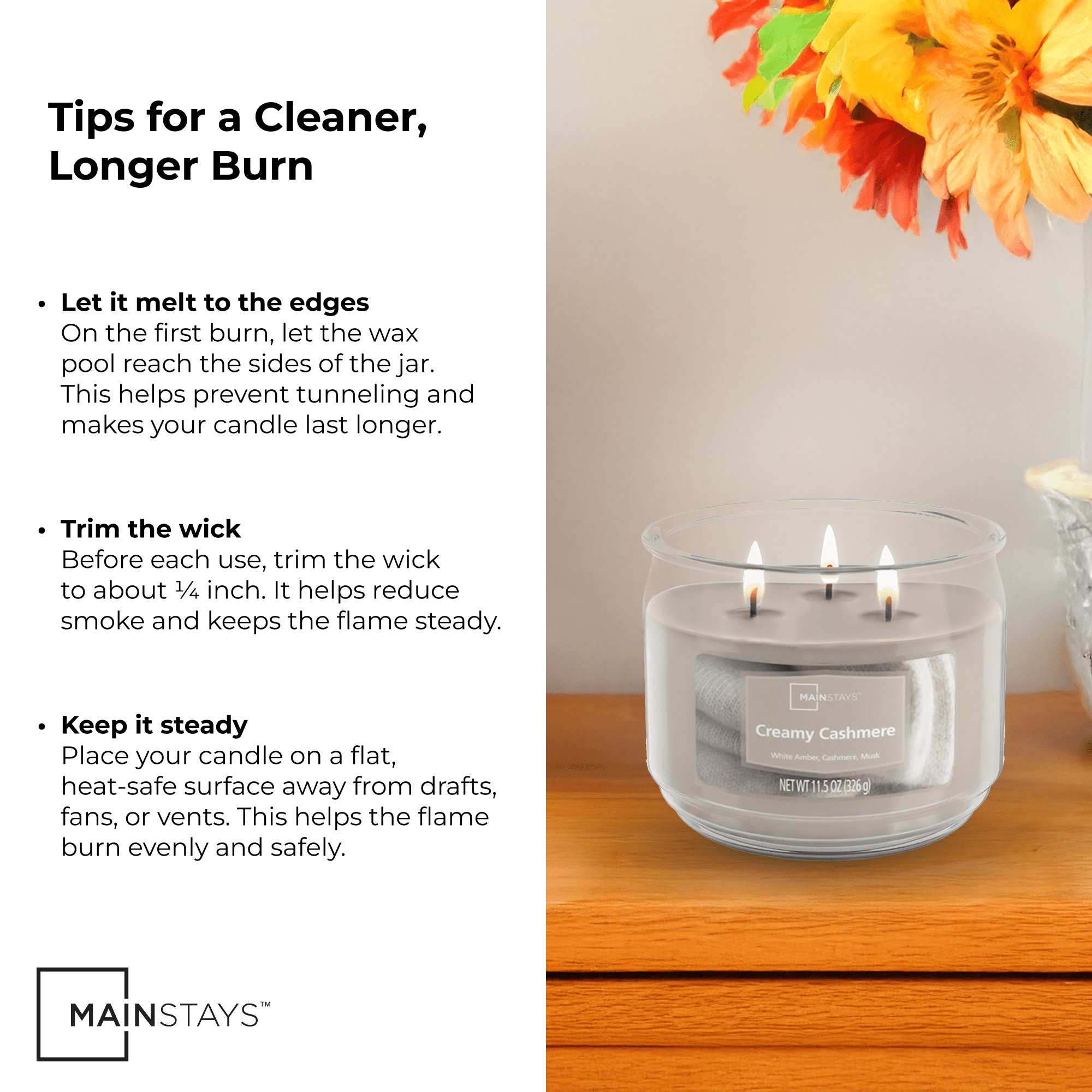 Three self-trimming cotton wicks provide a clean, even burn and amplify the fragrance throw
