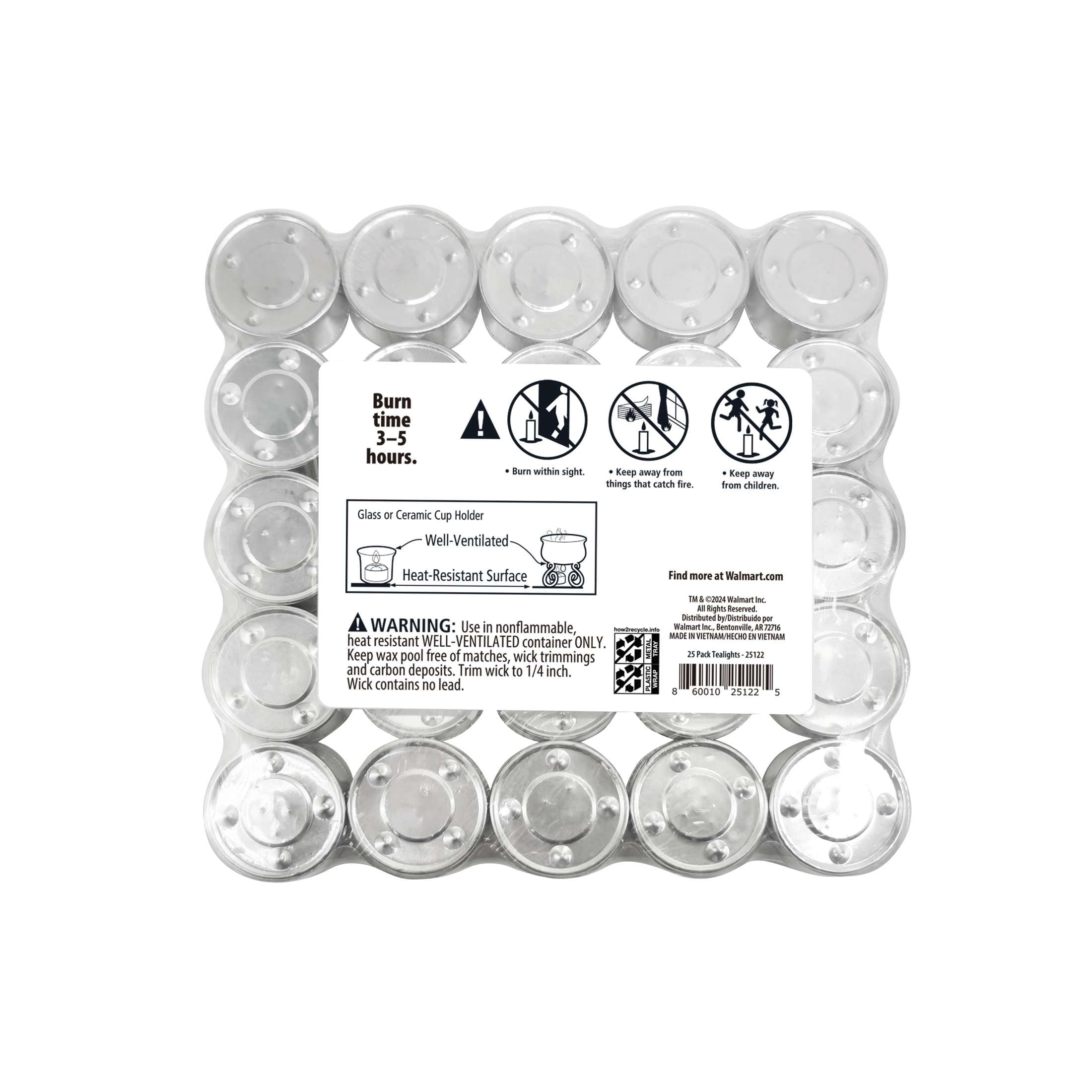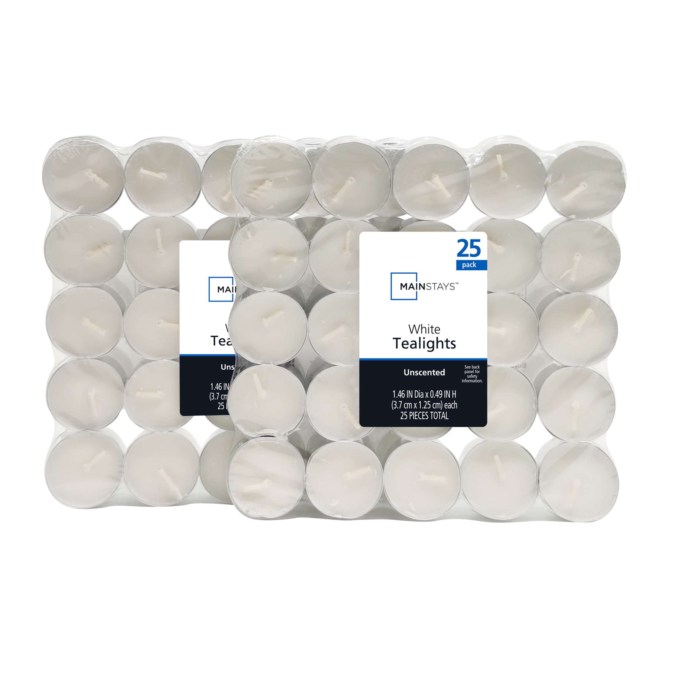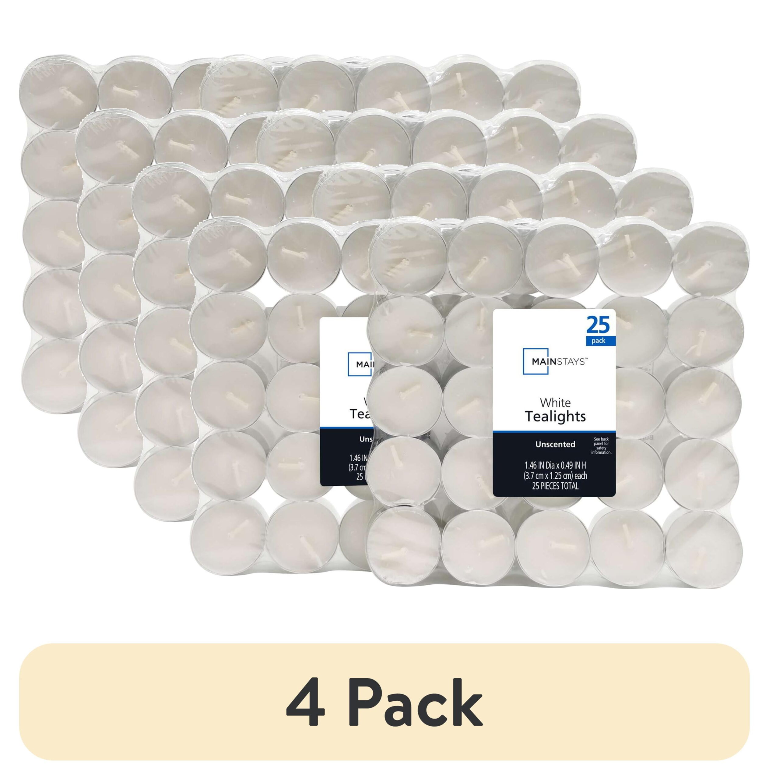 • Versatile Illumination: This 4-pack of Mainstays white unscented tealight candles, with 25 candles per pack, is suitable for both indoor and outdoor decorative and lighting use.