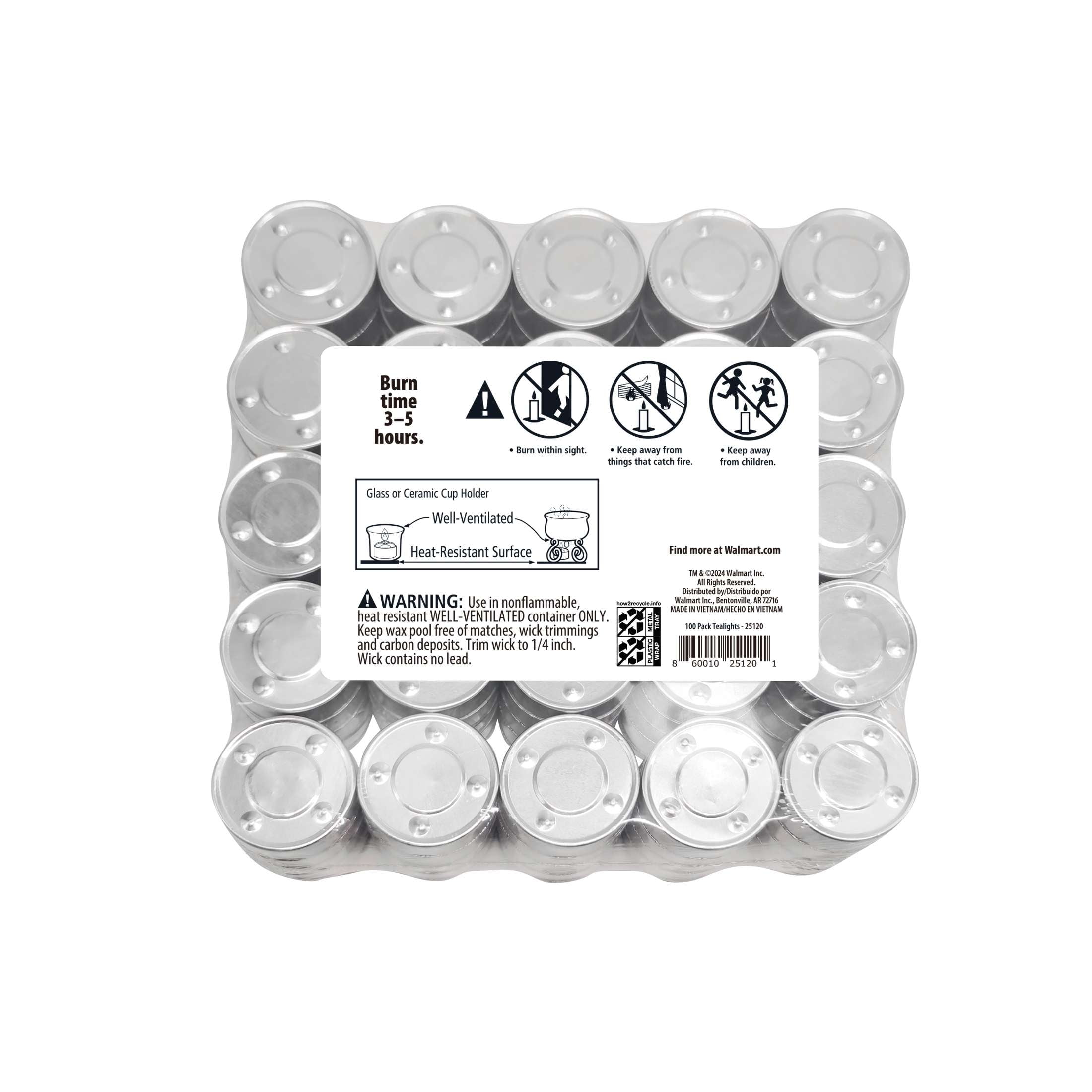 Mainstays unscented, 100-pk white tealights are a home decoration staple. With multiple uses, tealights can be used for your everyday decorating needs or to make special occasions sparkle, or for those emergencies when the power goes out. Long burning at around 3 hours each will provide the light and ambiance you need in any situation. Each tealight measures 1.46 inches in diameter and is in its own aluminum cup, and these fit most decorative tealight holders. Shrink-wrapped and stacked for added protection. Indoor and outdoor use. For optimal performance, the cotton wick should be trimmed to ?? before lighting. Keep away from children and pets.