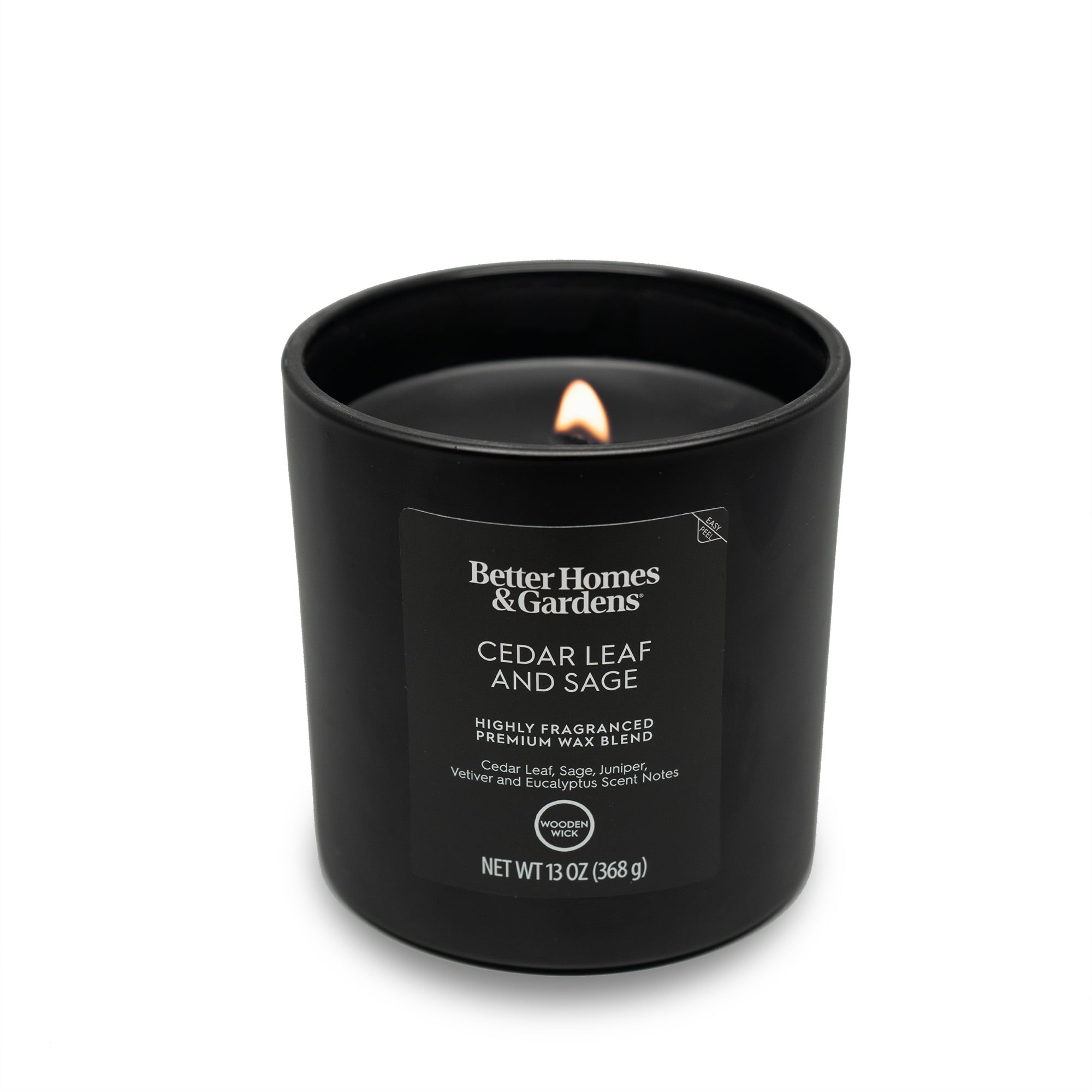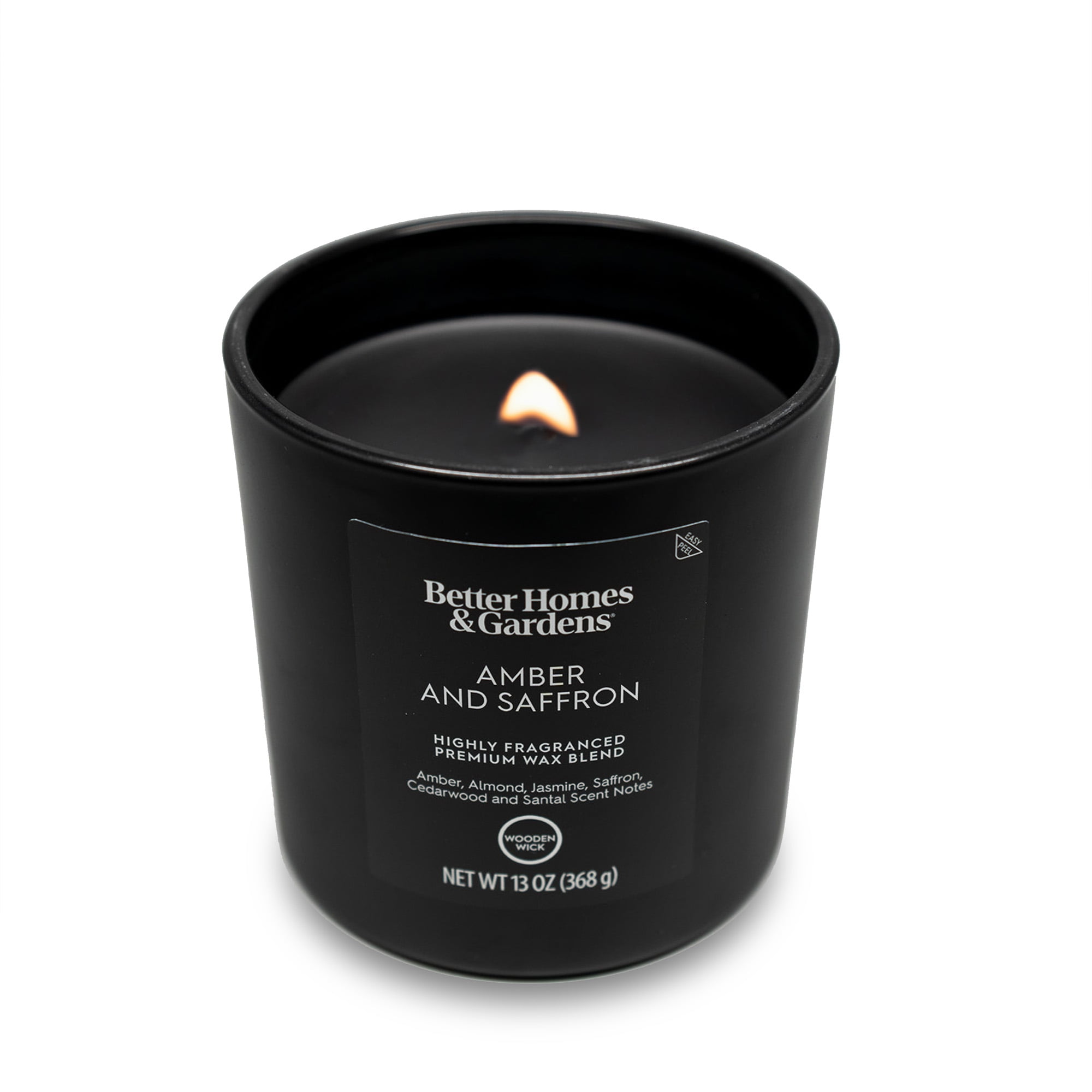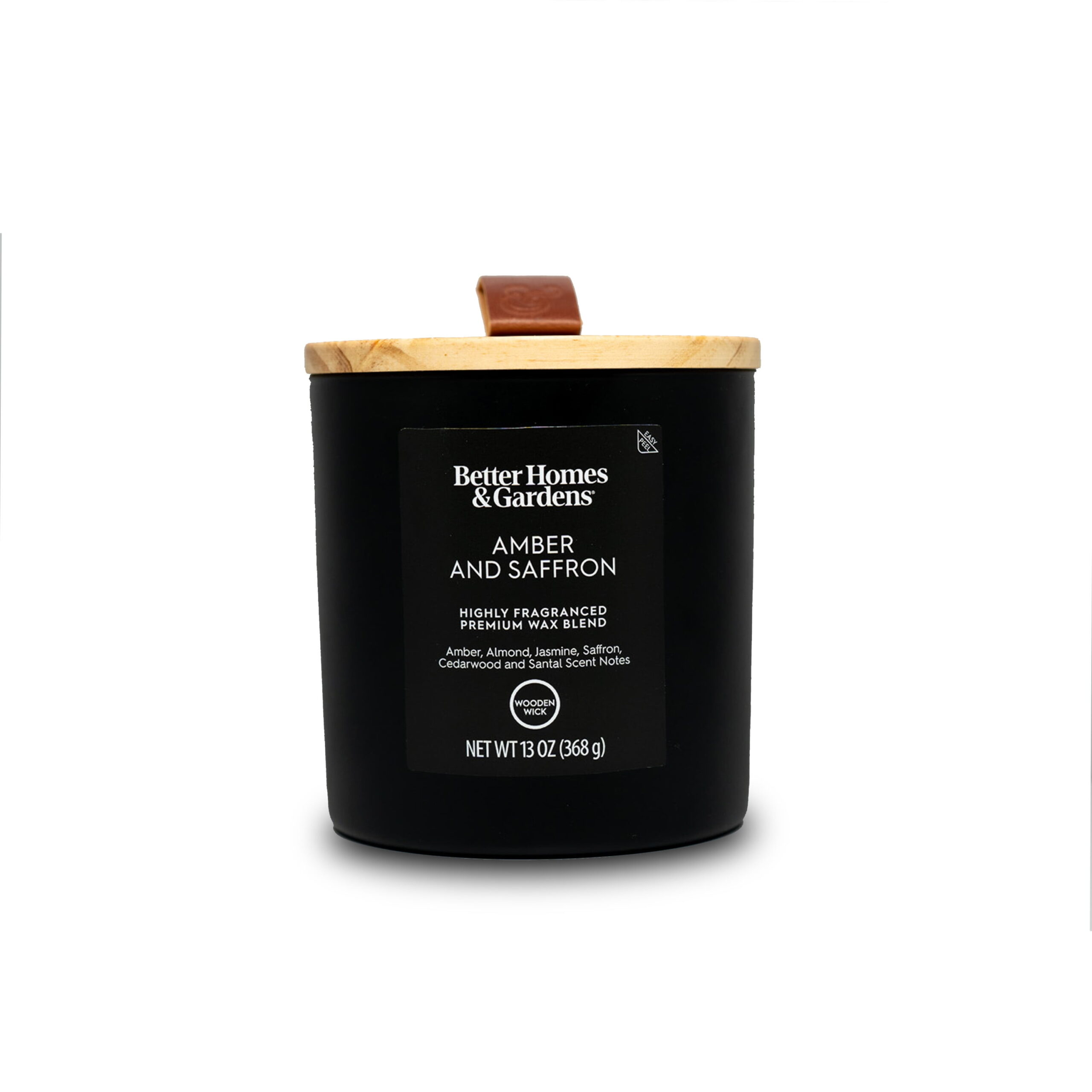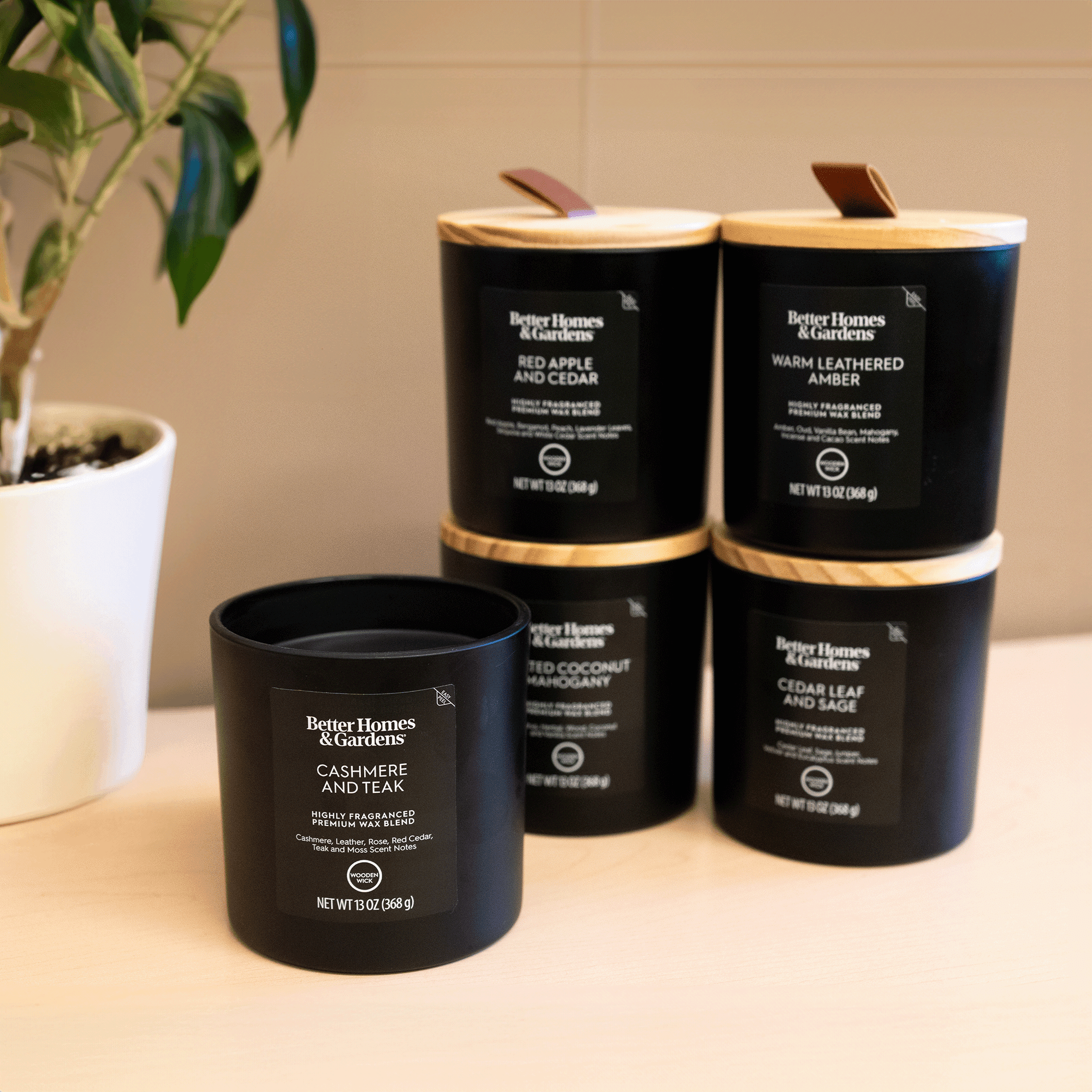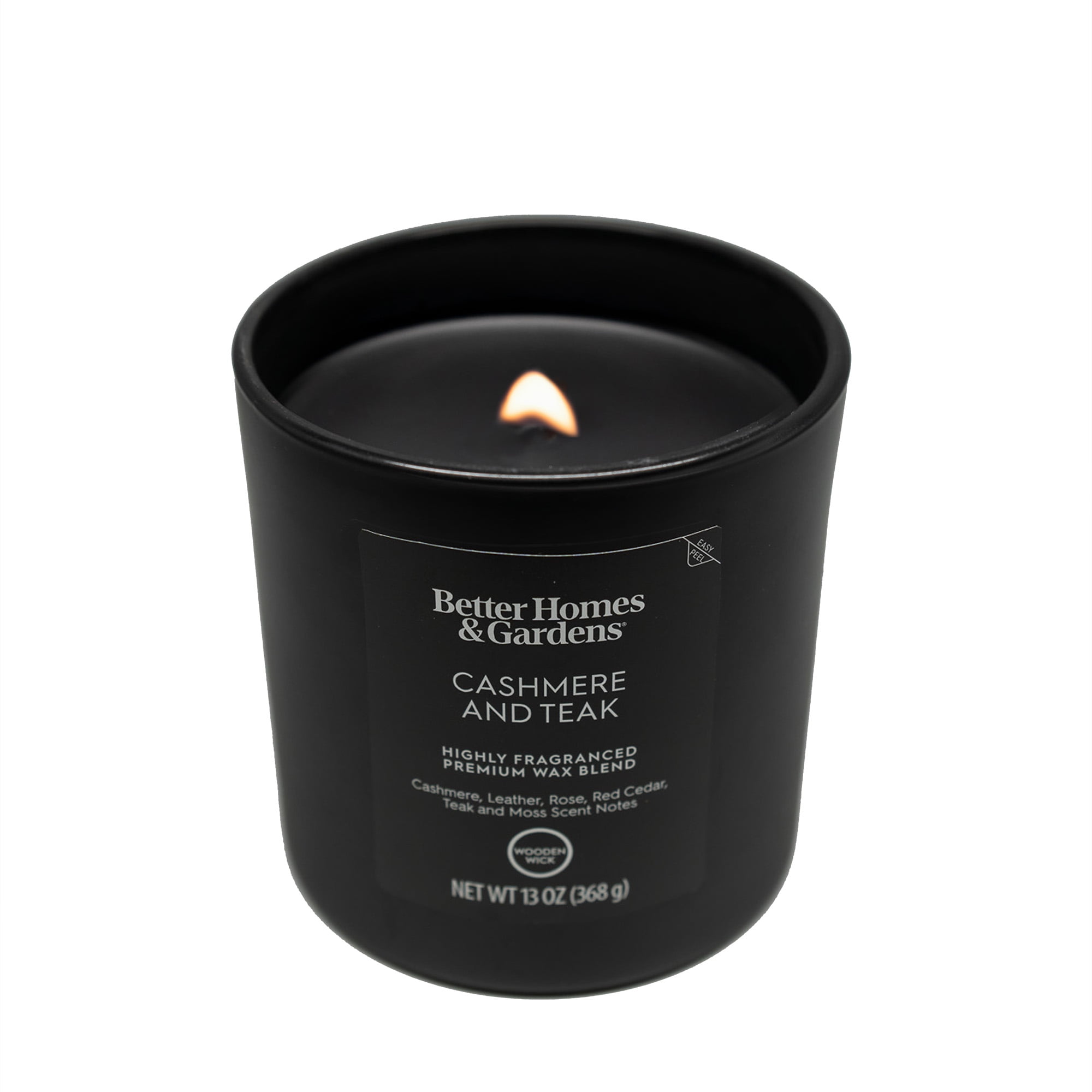 The Better Homes & Gardens 13oz Cashmere and Teak Scented Wooden Wick Jar Candle provides a warm glow and soft crackling sound when lit. This attractive matte black jar features a wooden lid with a leather pull. This highly fragranced candle in a paraffin wax blend is perfect for a variety of rooms in your home and will easily complement your existing decor. This enjoyable fragrance offers a citrus-infused blend with warm notes of brushed suede and wooly cashmere embellished with white rose accents, red cedar, rich moss, and sparkling musk. You are sure to enjoy this indulgent fragrance in your home.
