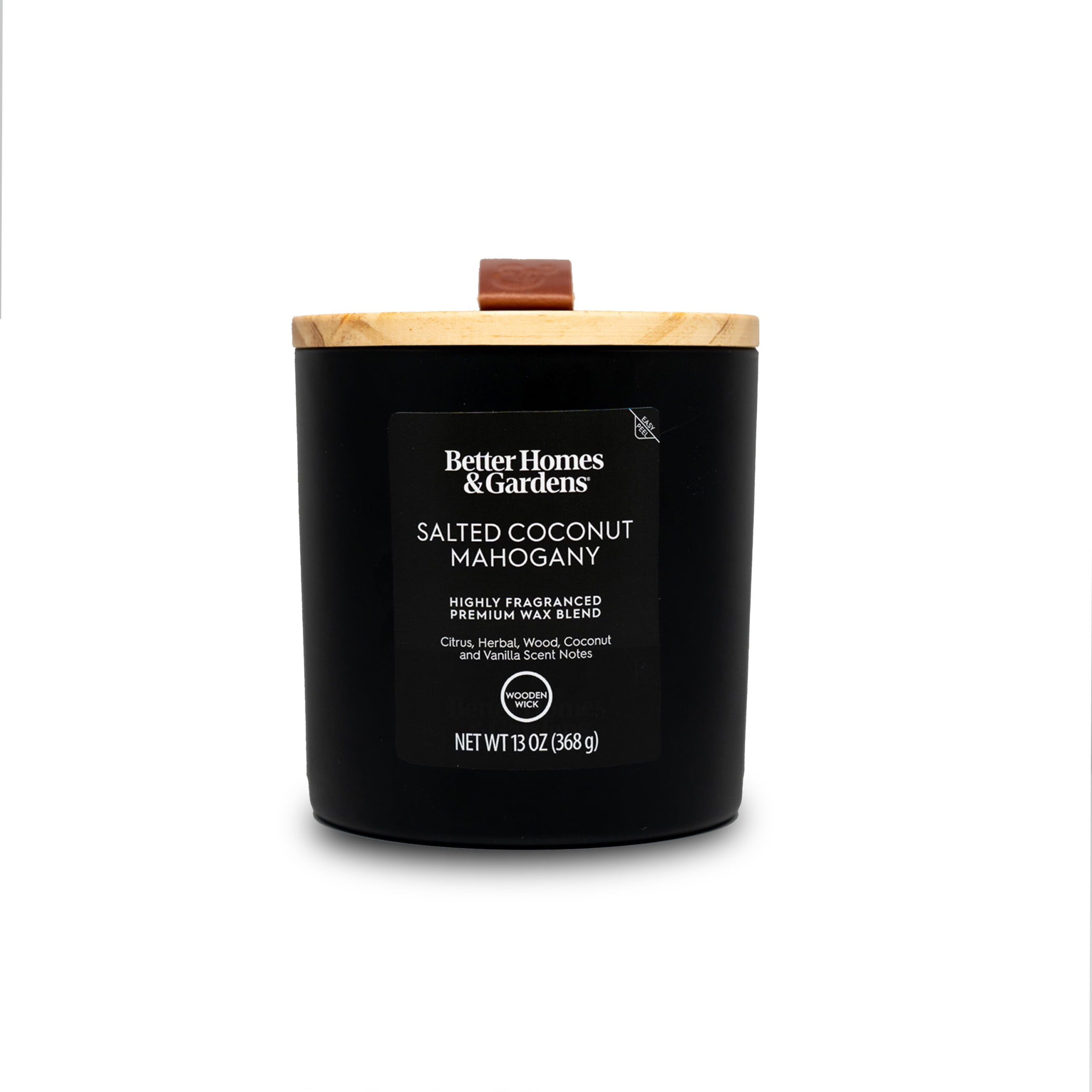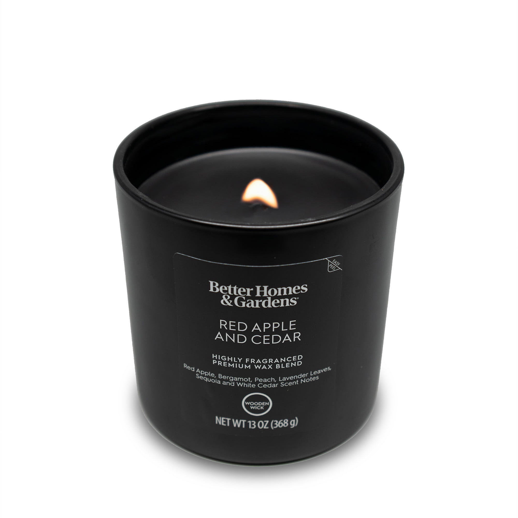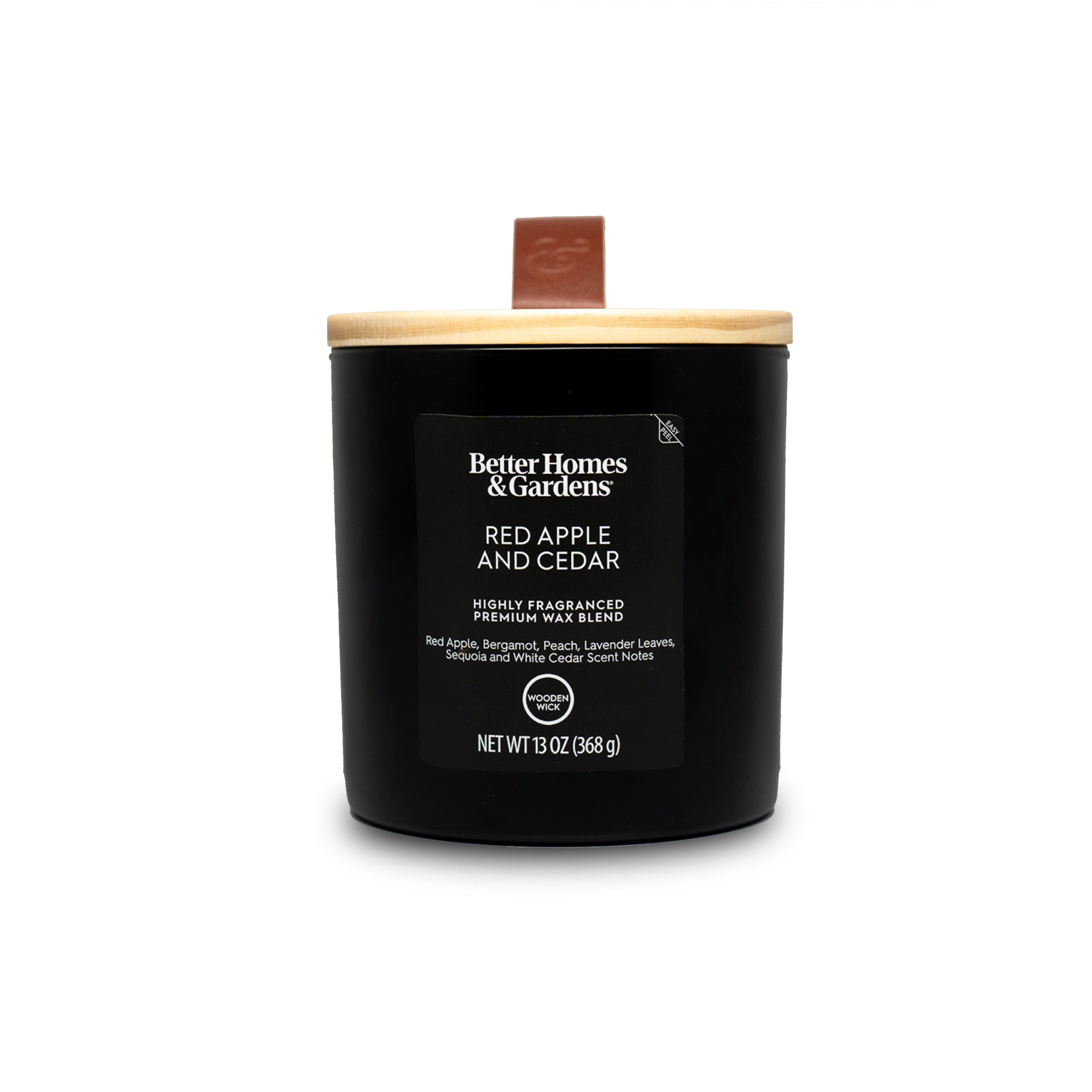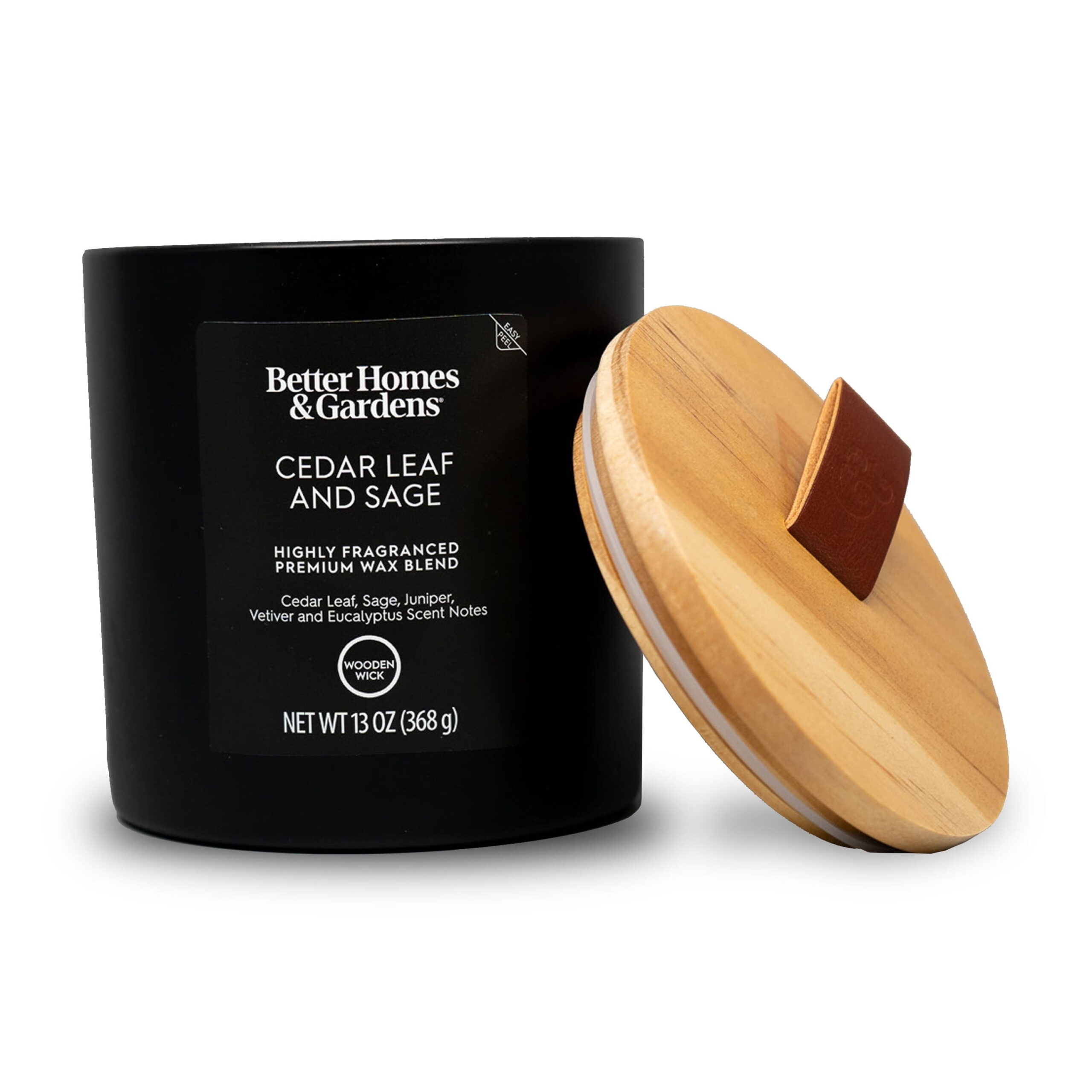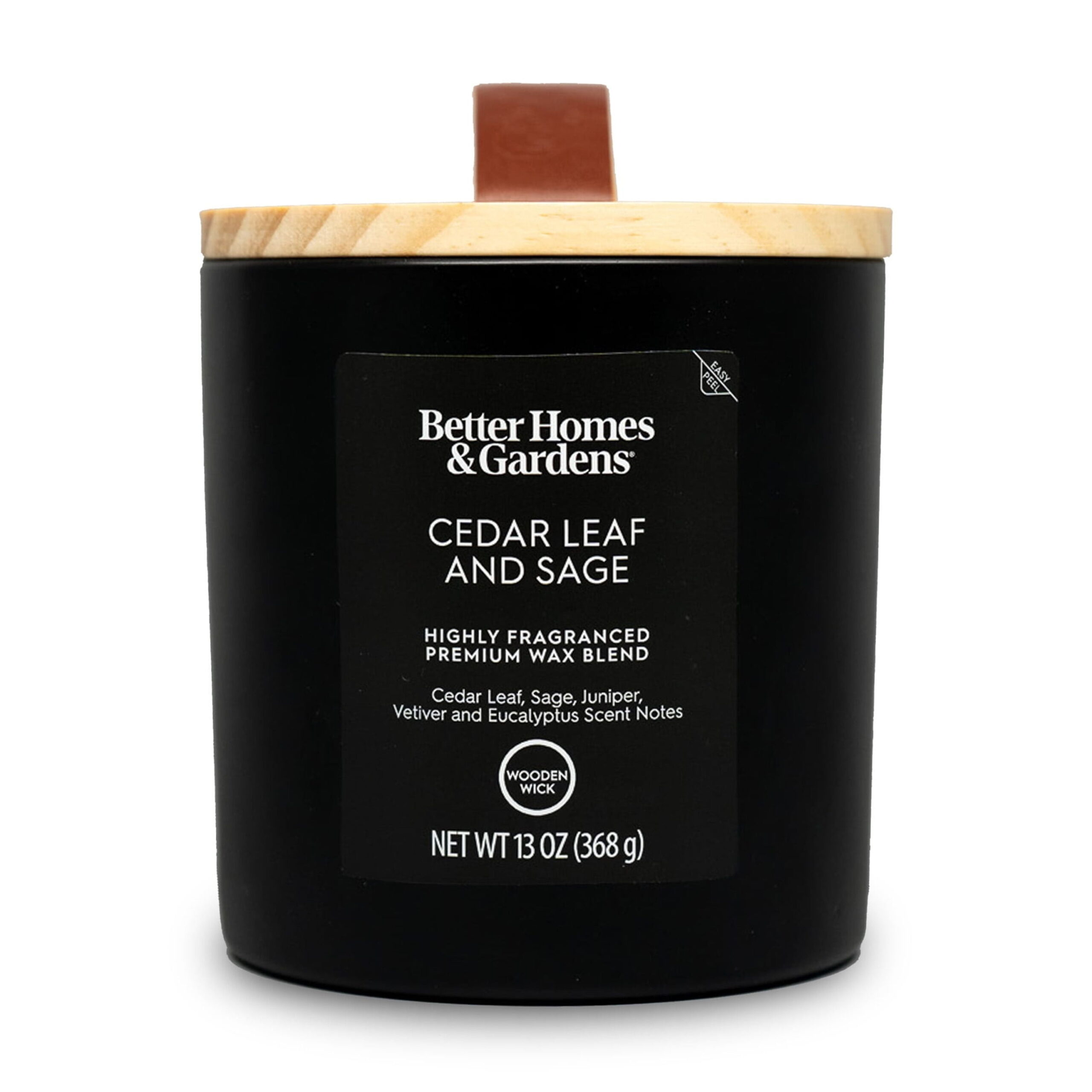 The Better Homes & Gardens 13oz Cashmere and Teak Scented Wooden Wick Jar Candle provides a warm glow and soft crackling sound when lit. This attractive matte black jar features a wooden lid with a leather pull. This highly fragranced candle in a paraffin wax blend is perfect for a variety of rooms in your home and will easily complement your existing decor. This enjoyable fragrance offers a citrus-infused blend with warm notes of brushed suede and wooly cashmere embellished with white rose accents, red cedar, rich moss, and sparkling musk. You are sure to enjoy this indulgent fragrance in your home.