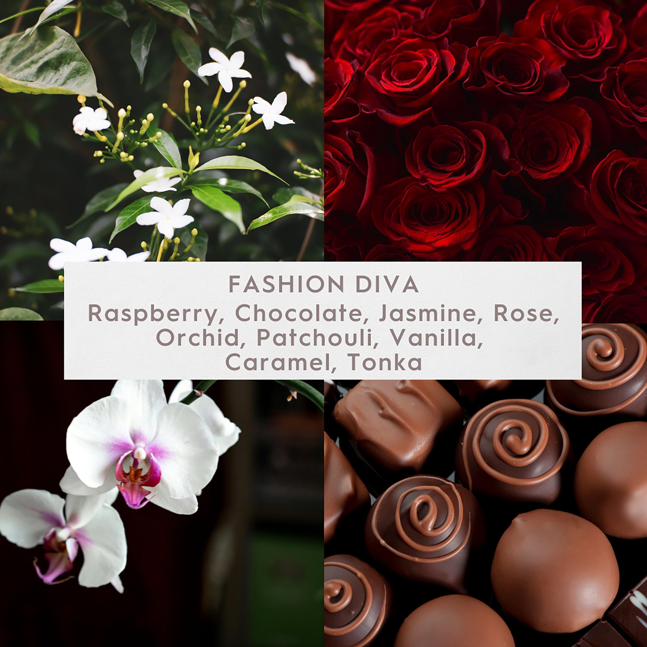 - Scent Notes: Raspberry, Chocolate, Jasmine, Rose, Orchid, Patchouli, Vanilla, Caramel, Tonka