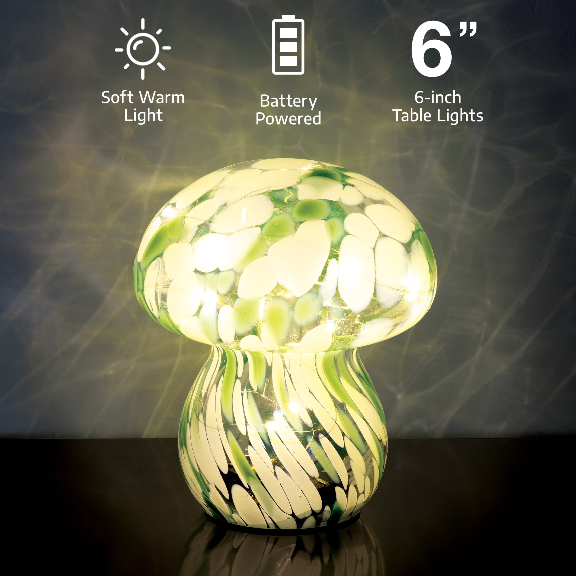 BrightSide Mushroom Confetti Glass Lamp – Sage/White, Battery-Powered Fairy Lights