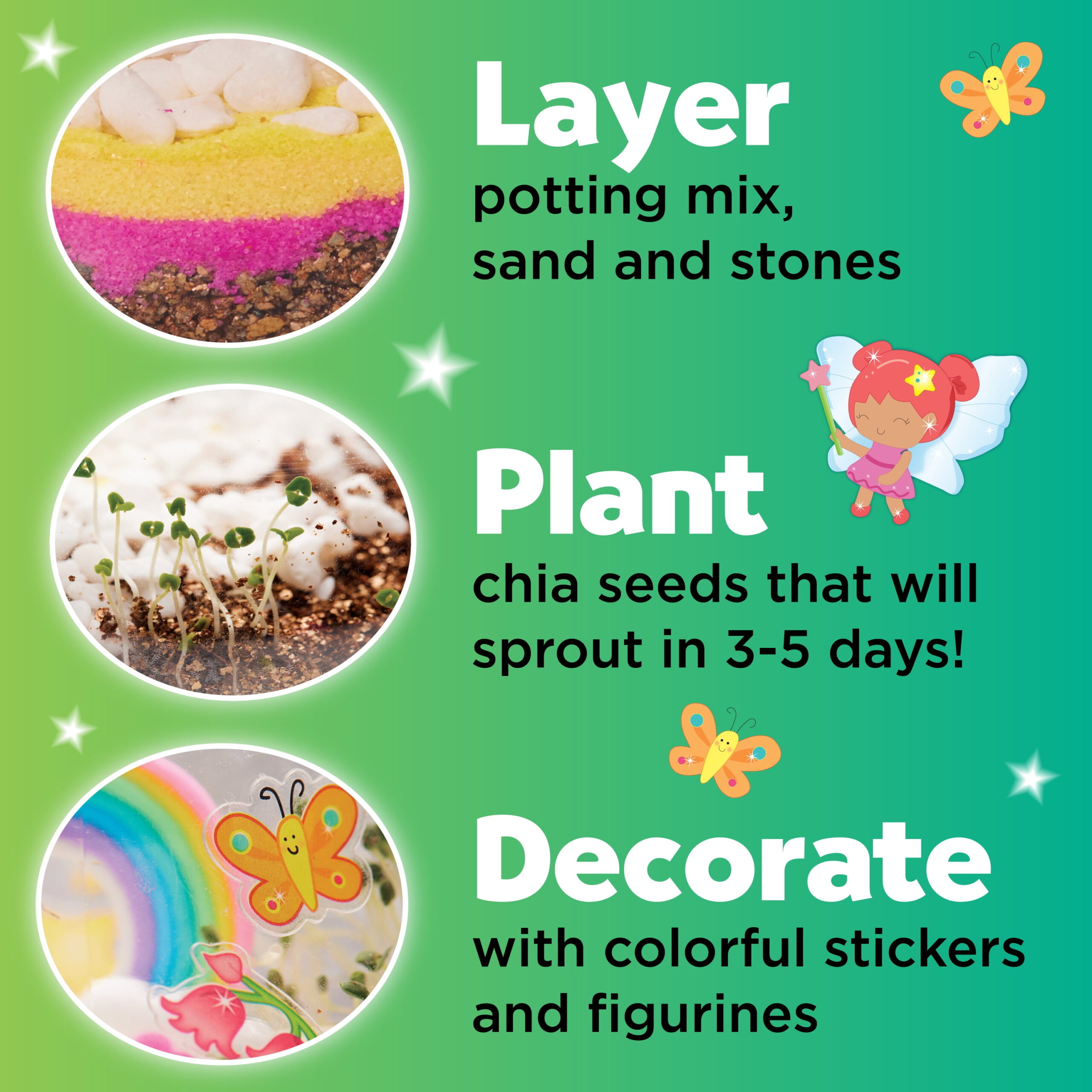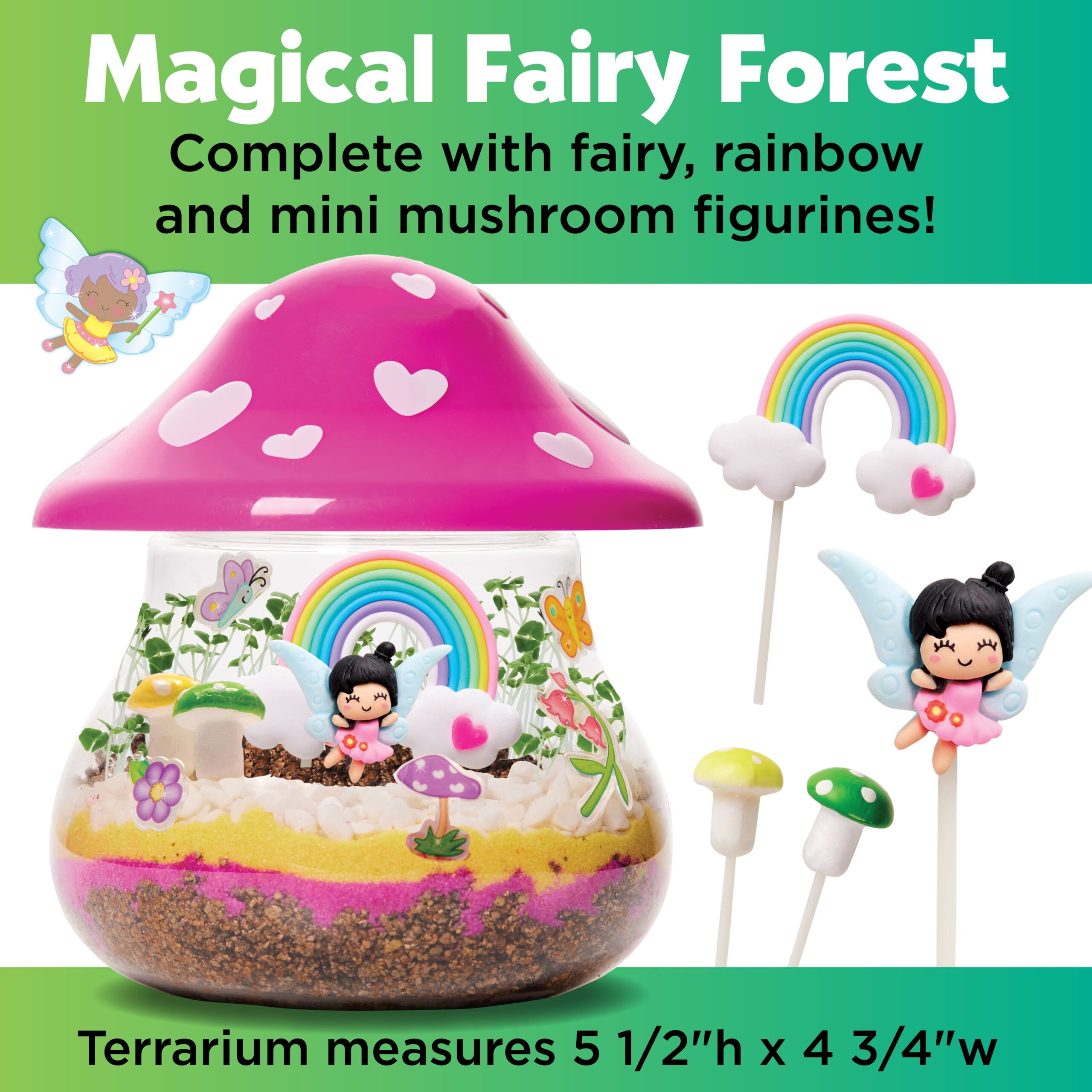 - Comprehensive Contents: This complete kit features a mushroom-shaped terrarium, a fairy figurine, potting mix, stickers, colorful sand, a rainbow, and mini-mushroom figurines.