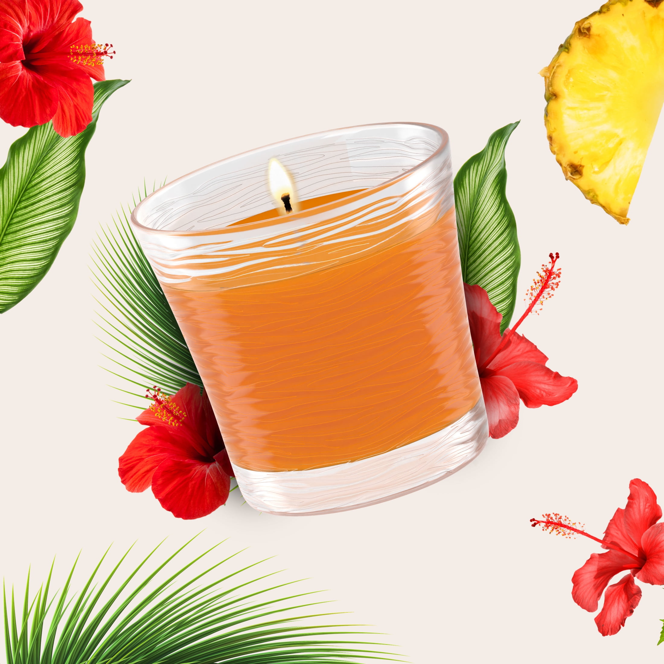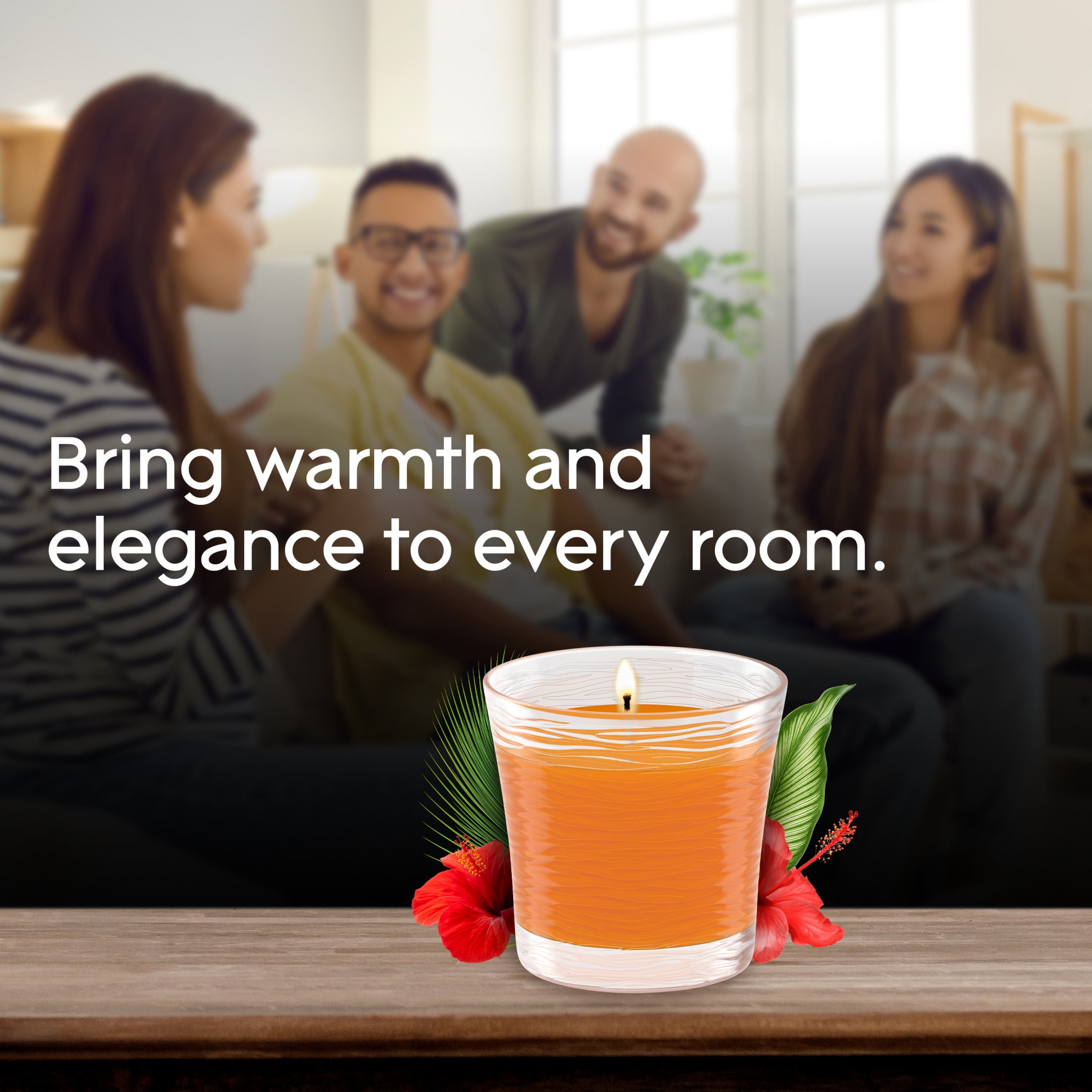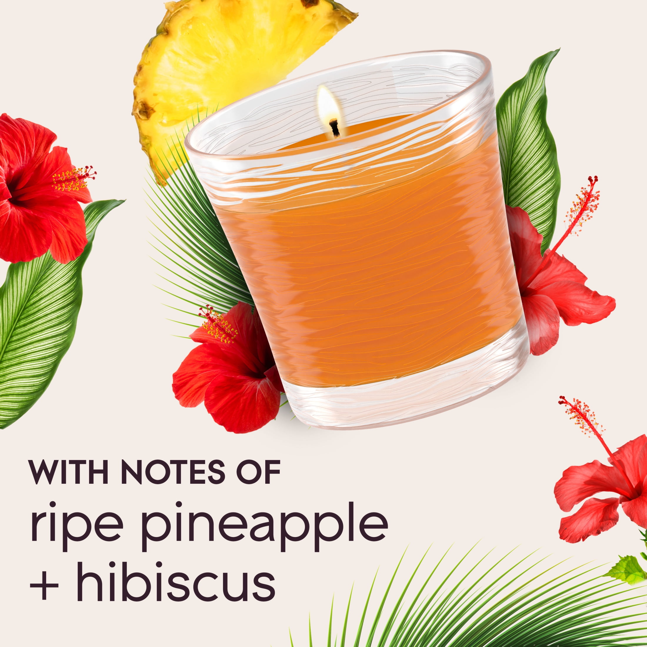 Surround yourself with scent and a soft glow with the Glade Hawaiian Breeze candle which features relaxing notes of ripe pineapple, hibiscus and peach nectar