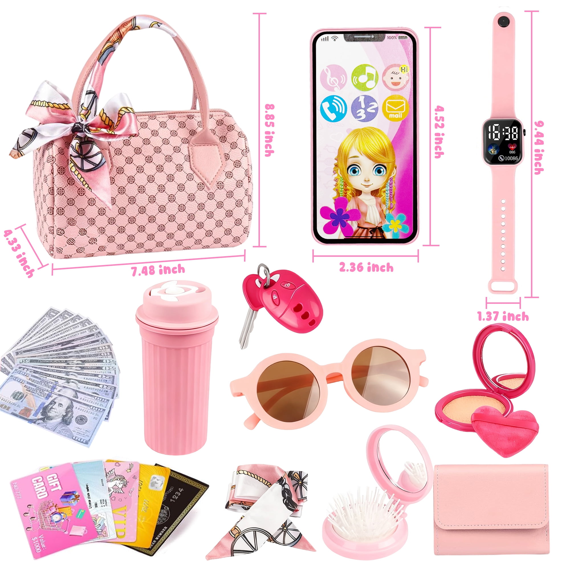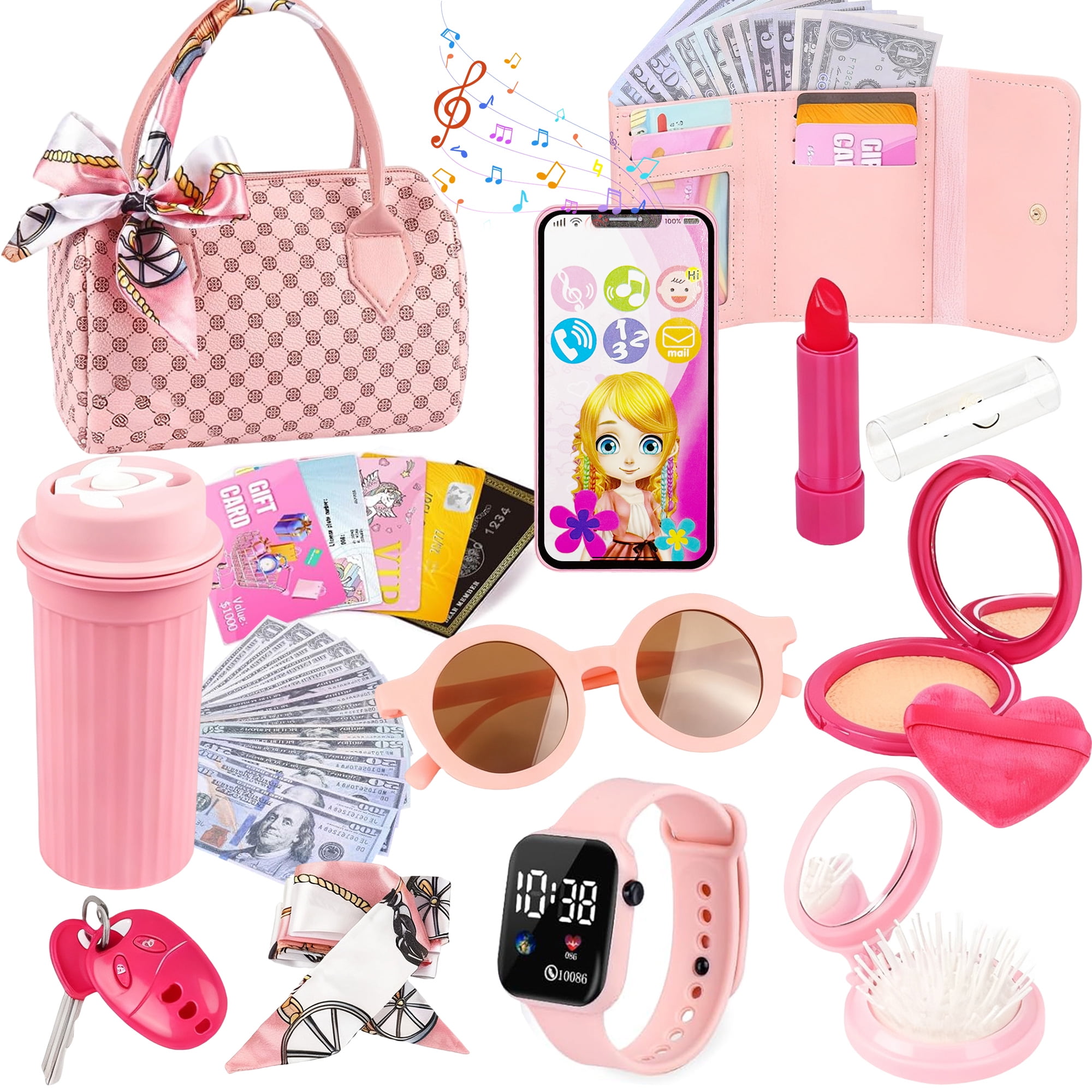 Handbag, Purse, Silk Scarf, Toy Phone, Working Kids Watch, Water Bottle, Sunglasses, Pretend Makeup Kit, Play Money, Cards, Keys