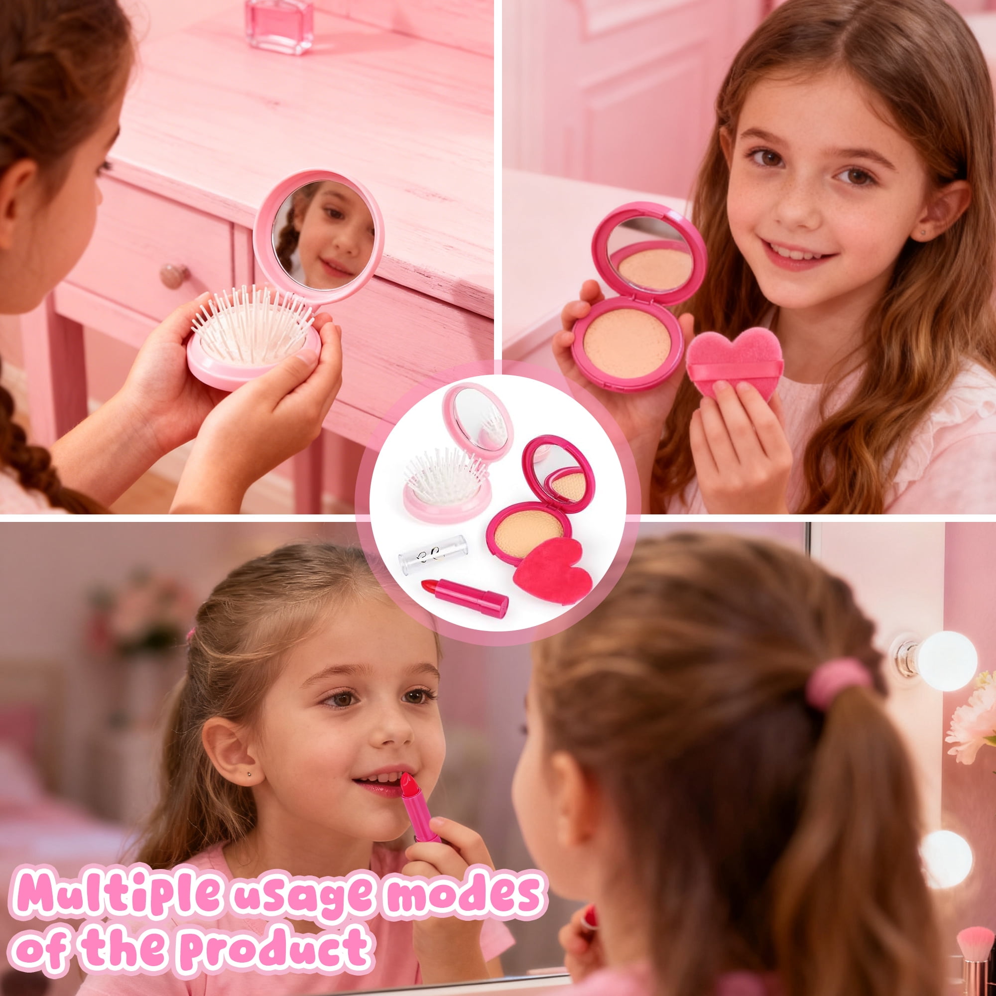 • Safe Pretend Makeup: The makeup kit contains non-toxic, mess-free lipstick, powder case, puff, and brush, encouraging creative play without real cosmetics.