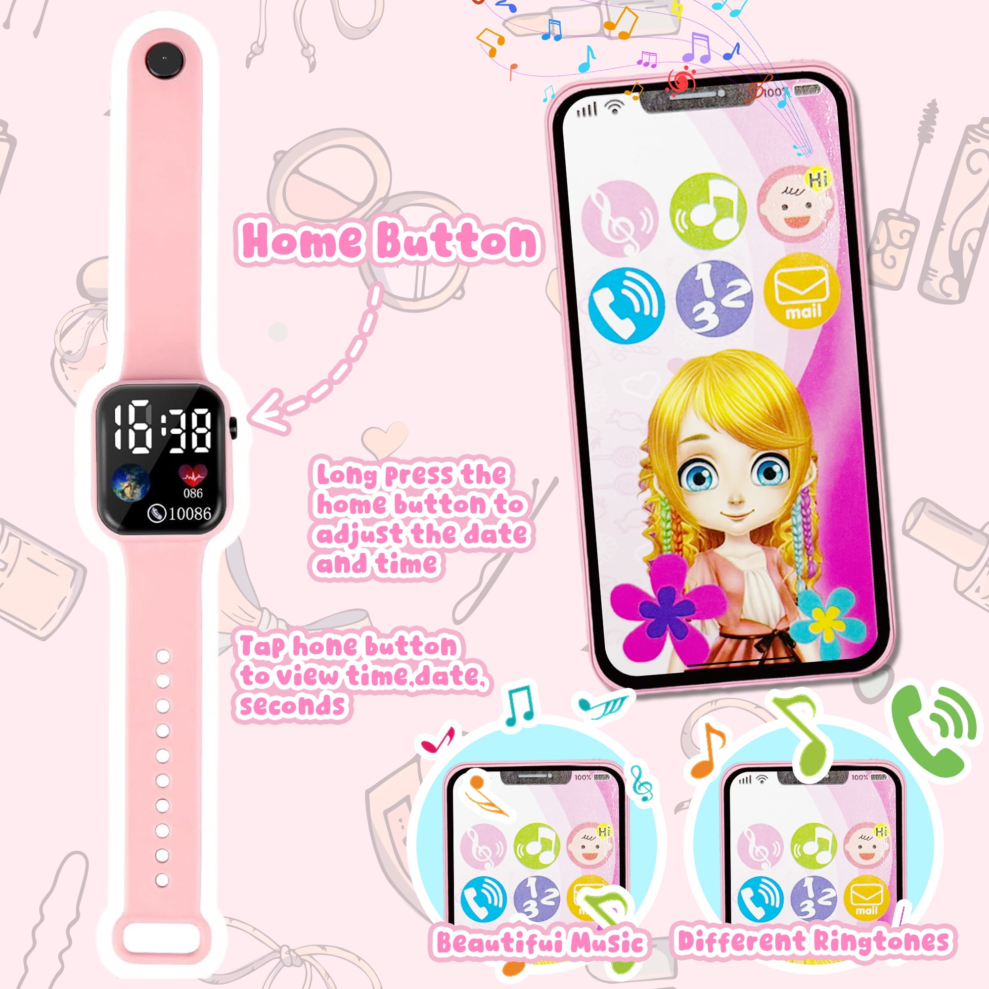 • Interactive Features: The toy phone has pressable buttons for music and ringtones, while the digital wristwatch displays adjustable time and date for realistic play.