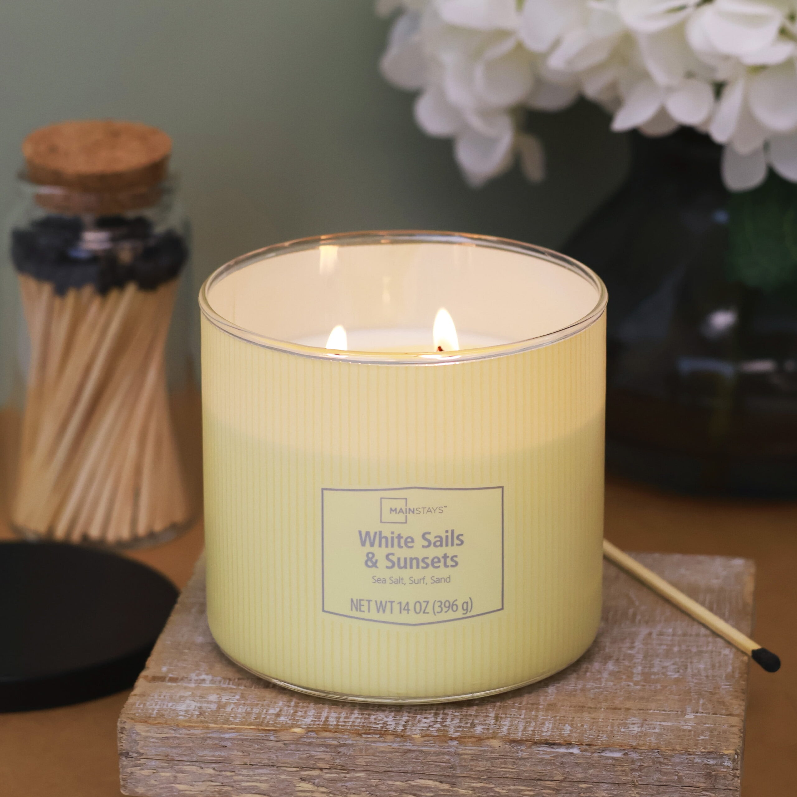 The Mainstays 3-Wick Textured Wrapped Candle in White Sails and Sunsets Fragrance is perfect for enhancing your home ambiance. This elegant candle features a decorative wrap and three wicks, ensuring a longer burn time and more even scent distribution. The aromatic blend of sea breeze and warm sunsets creates a soothing atmosphere, ideal for any occasion. With its 14-ounce size, this candle is a perfect centerpiece for your living room or bedroom, making it a versatile decor addition to complement any style.