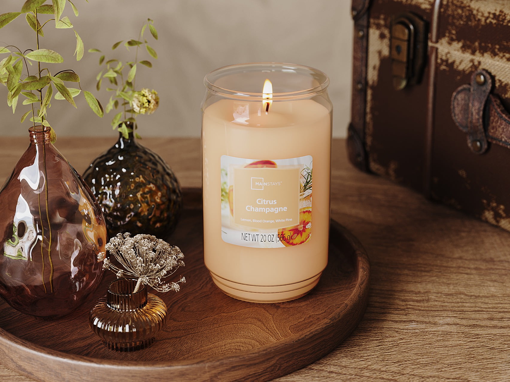 Refresh and uplift your space with the sparkling aroma of the Mainstays Citrus Champagne Scented Single-Wick Glass Jar Candle, 20 oz—a bright, citrus-inspired fragrance that brings energy and sophistication to any room. This soothing scented candle blends zesty lemon, sweet blood orange, and crisp white pine for a lively, balanced aroma that invigorates the senses. Whether you’re relaxing after a long day, entertaining guests, or adding a cheerful, fresh touch to your home décor, this long-lasting scented candle delivers a clean burn and a soft, ambient glow. Perfect for living rooms, bedrooms, or dining areas—and a thoughtful gift for anyone who loves vibrant, citrusy scents.