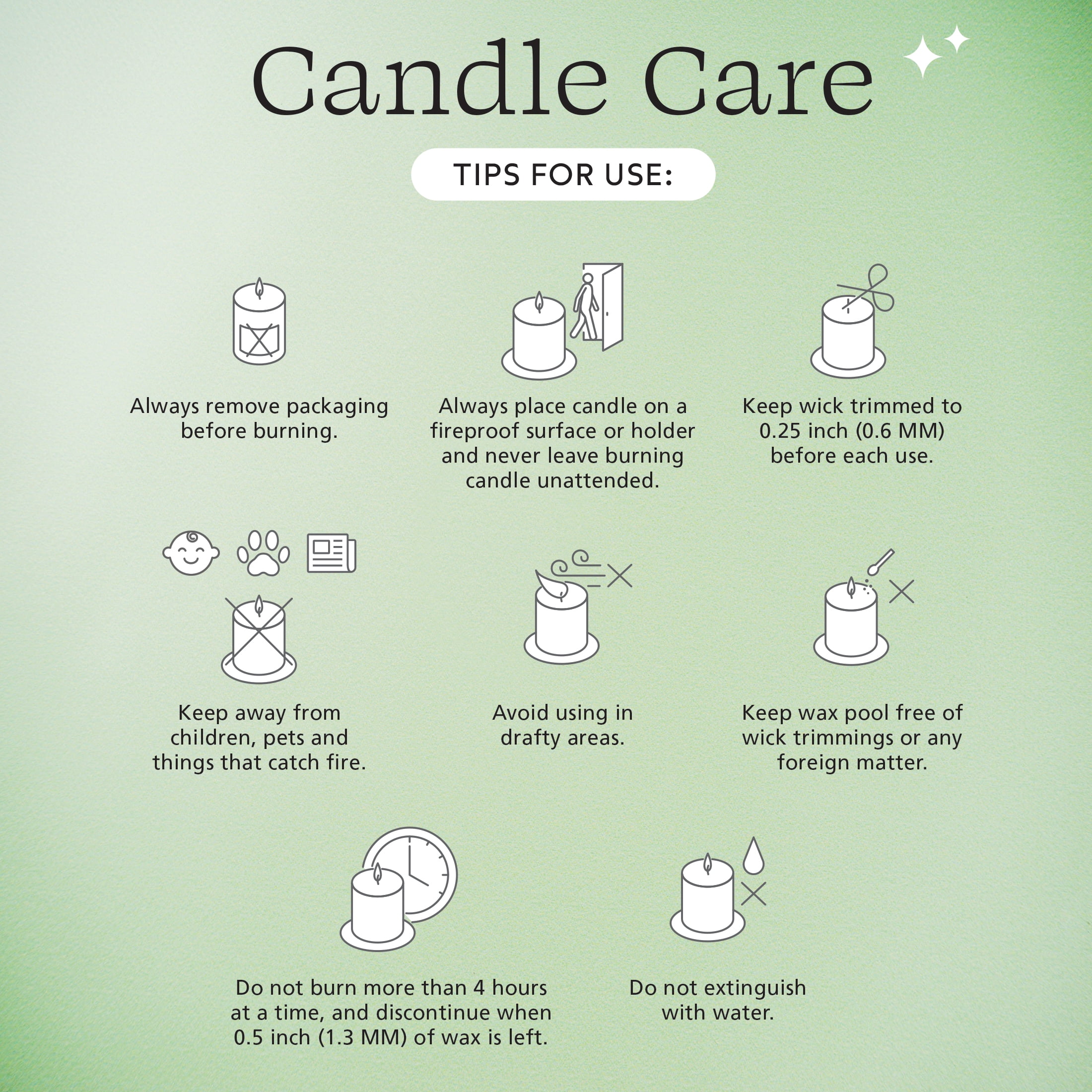 Safety Tips: Always burn within sight, use a heat-resistant holder, trim wick to 1/4 inch before use, and avoid burning for more than 4 hours at a time.