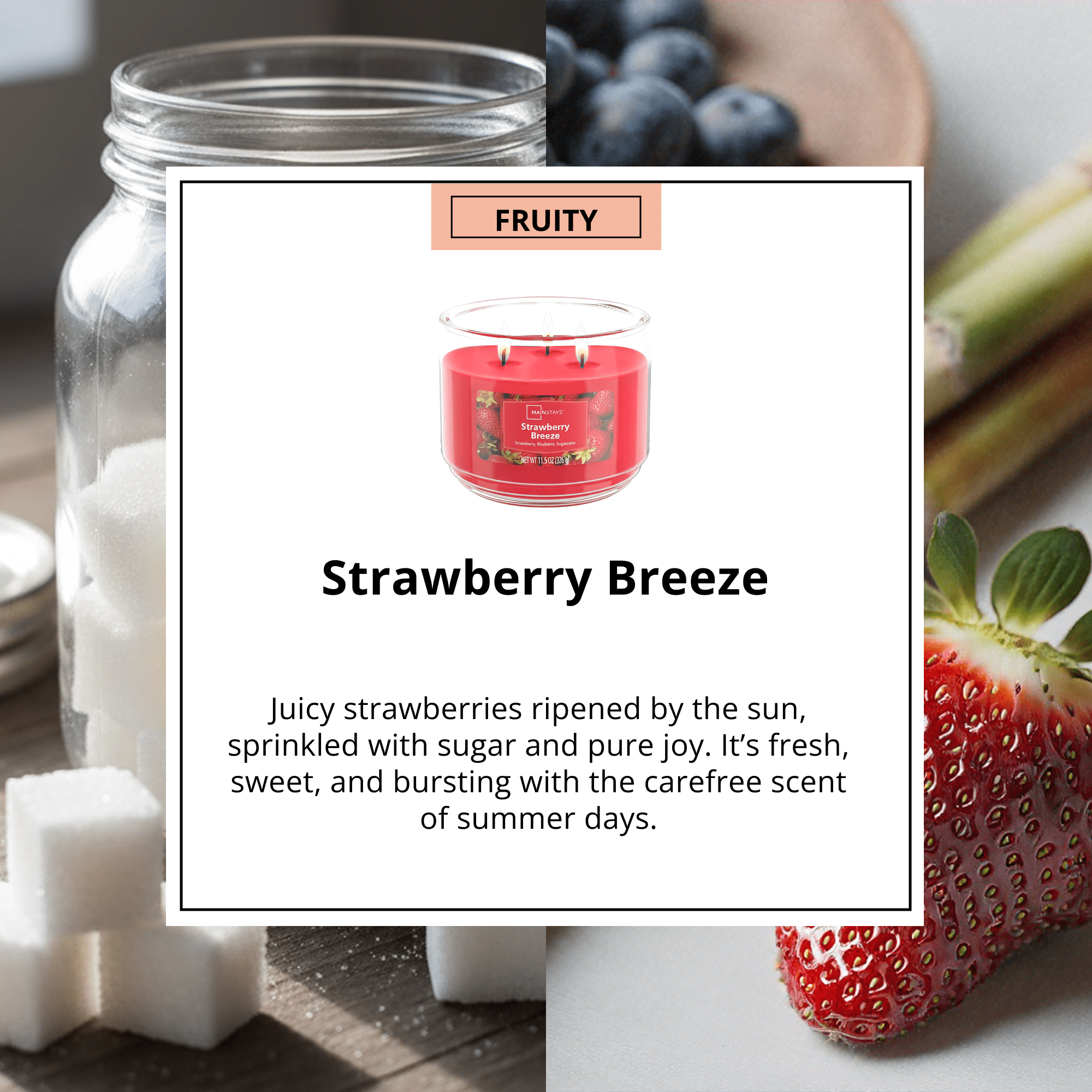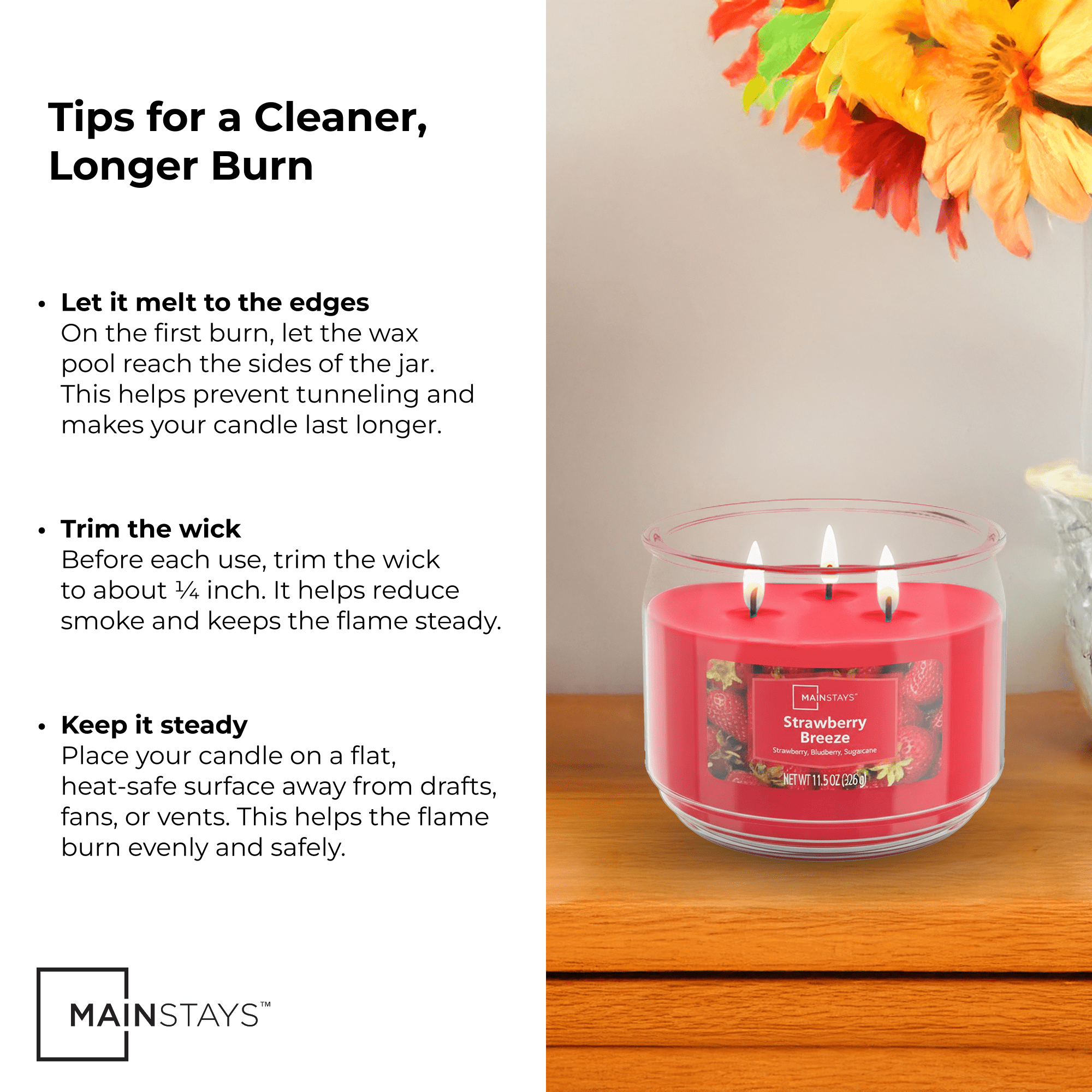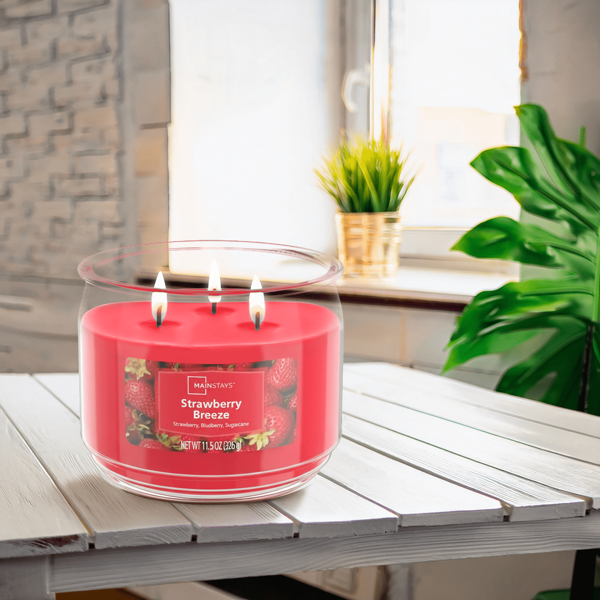 Brighten your home with the sweet, sun-ripened scent of the Mainstays Strawberry Scented 3-Wick Glass Jar Candle, 11.5 oz—a fresh, fruity fragrance that captures the carefree essence of summer. This lively scented candle features juicy strawberries, raspberries, and a hint of sugar cane for a vibrant, uplifting aroma that fills any room with warmth and happiness. Whether you’re relaxing, entertaining guests, or adding a cheerful touch to your home décor, this long-lasting scented candle delivers a clean burn and a soft, inviting glow. Perfect for living rooms, bedrooms, or dining areas—and a delightful gift for anyone who loves bright, fruit-inspired scents.