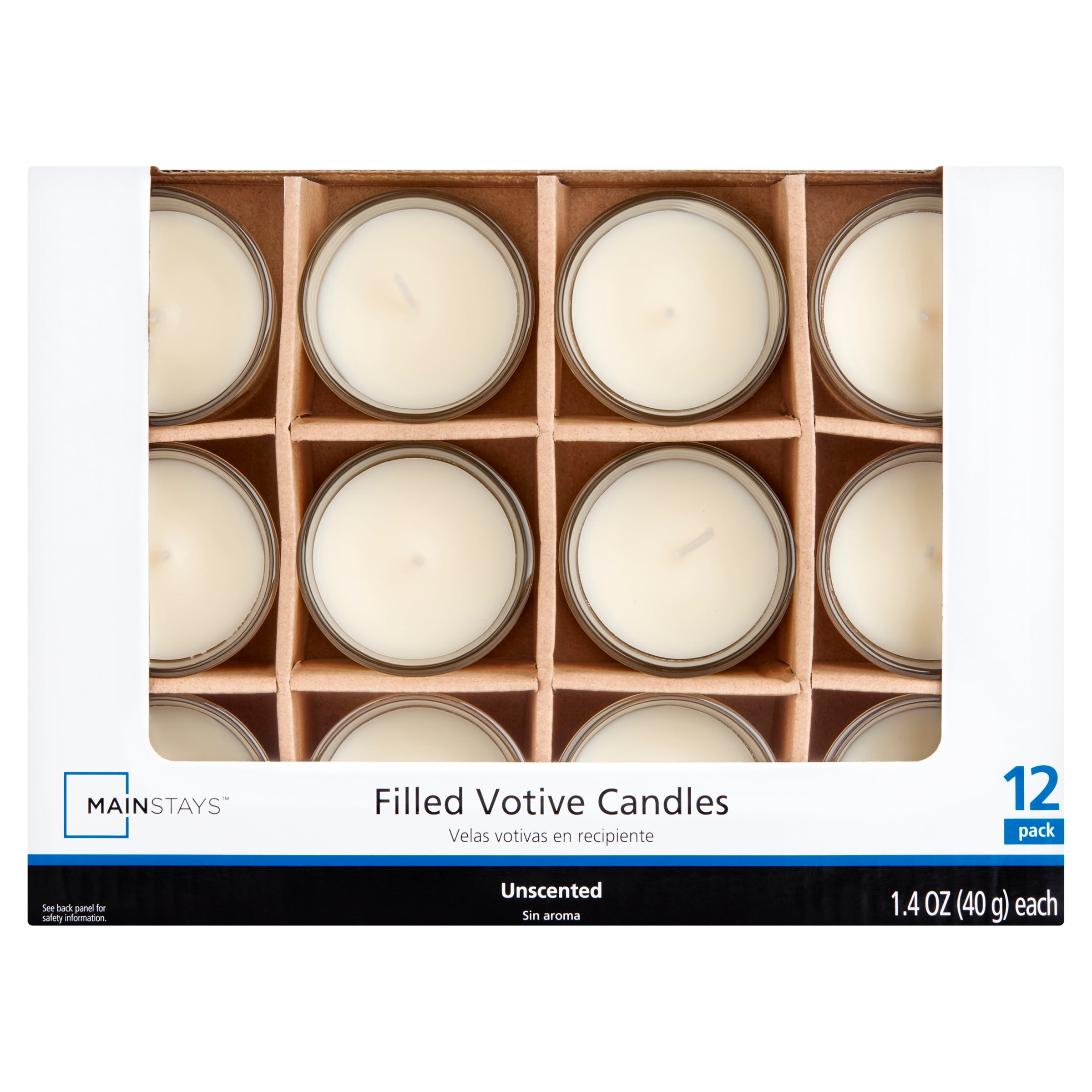 Fill your space with warm and ambient lighting with Mainstays Unscented Filled Votive Candles. They are filled in a clear glass and in a pack of 12, with 40g wax filled each. This unscented candle is good for everyday use including emergency power outages or simply providing warm, ambient light. They are also perfect for weddings, parties or other events. Mainstays unscented candles are available in tapers, votives, various sizes of pillars including a 3-wick 6×6. With the other styles in the same collection, you can create a candle scaping at home.