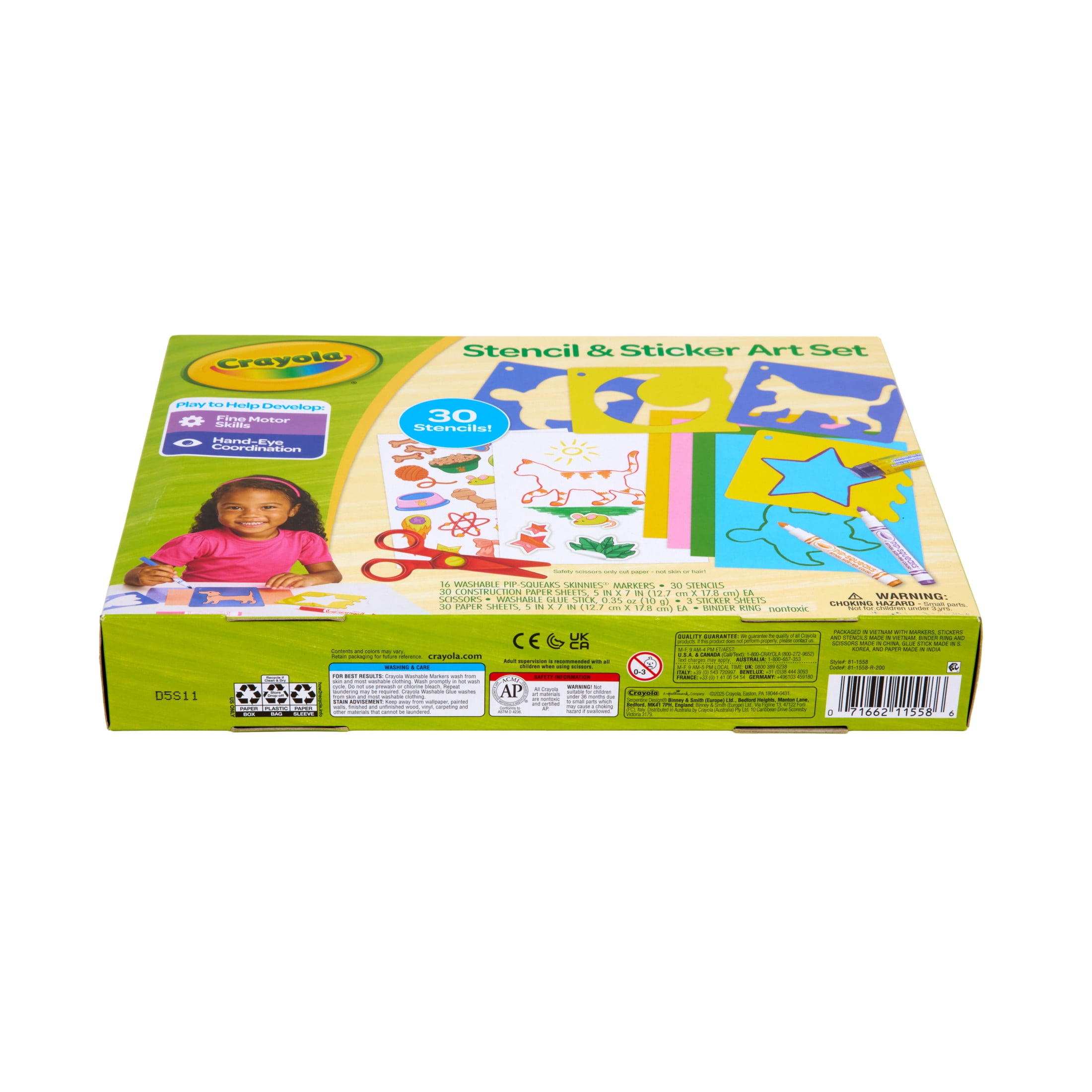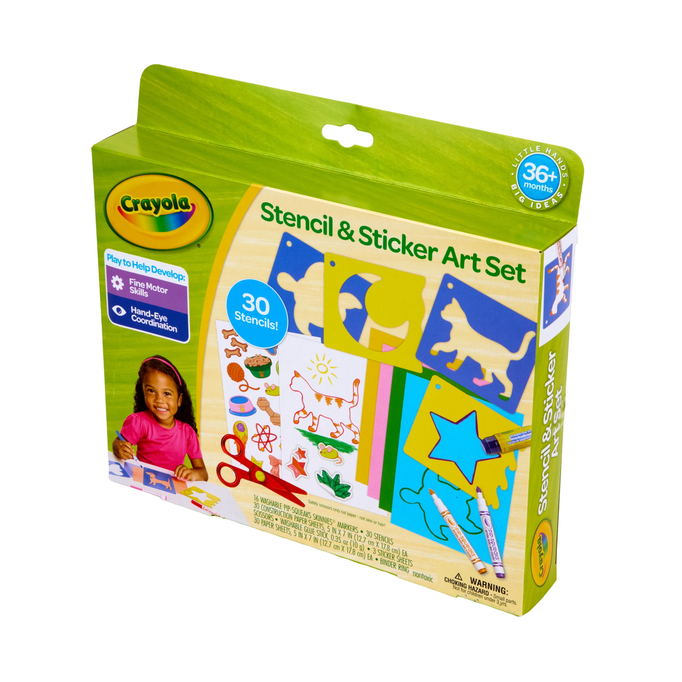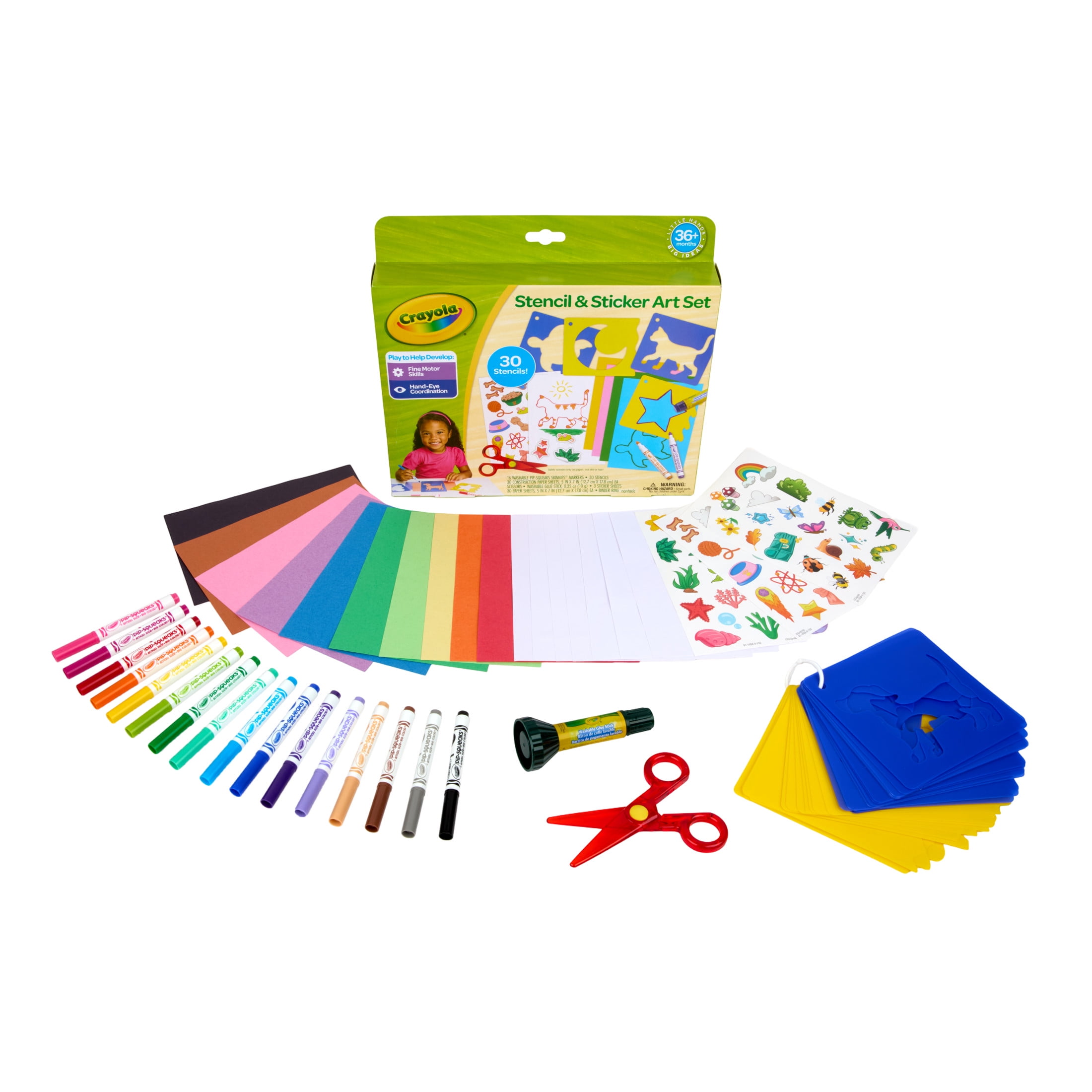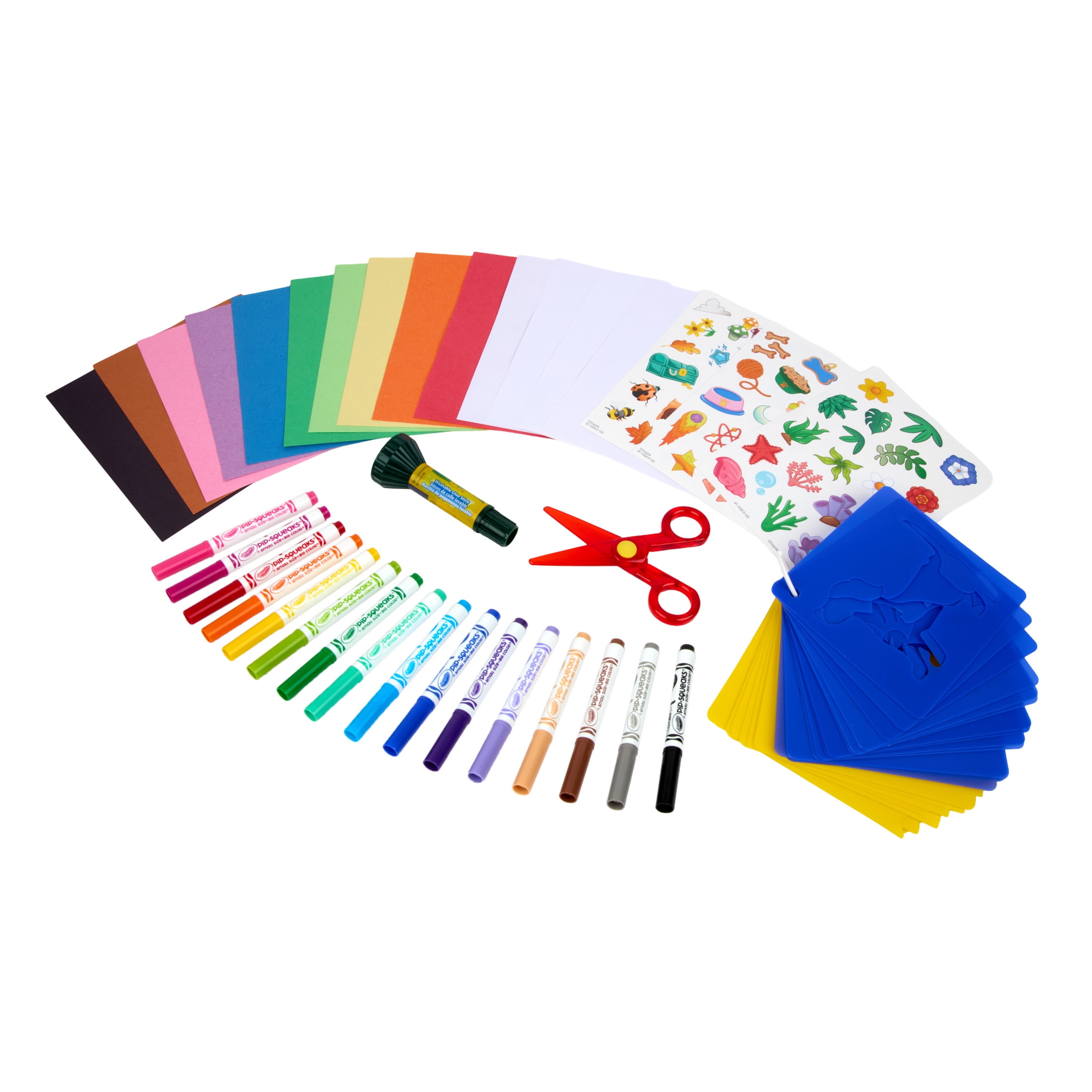 • Comprehensive Set: This art kit includes 30 stencils, 16 washable Pipsqueak Skinnies Markers, safety scissors, 3 sticker sheets, a washable glue stick, 30 sheets of 5×7 construction paper, 30 sheets of 5×7 blank paper, and a binder ring.